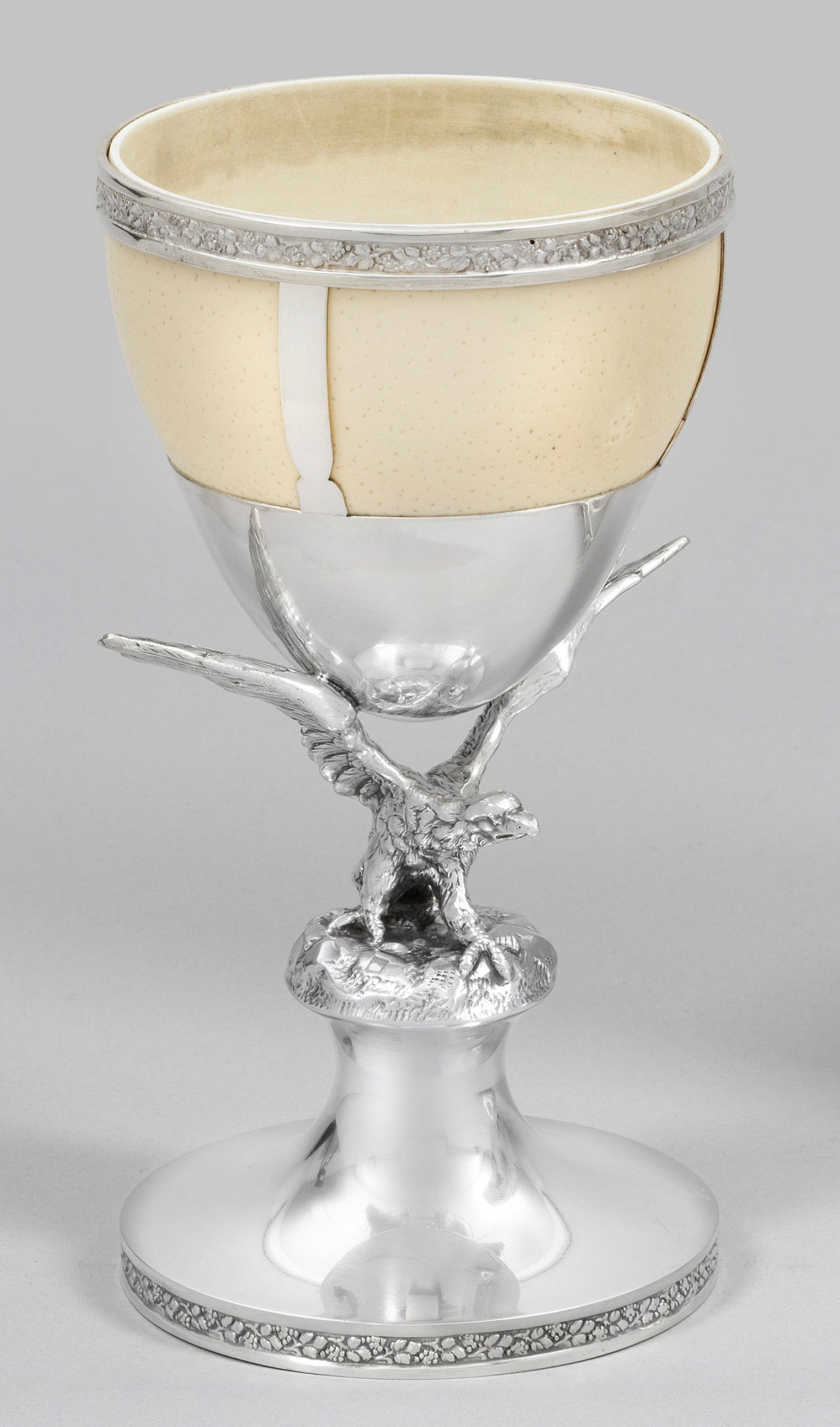 Silber. Von Weinranken umzogener Rundstand, übergehend in kurzen Schaft in Gestalt eines Adlers mit ausgebreiteten Flügeln als Träger für eine Kuppa, bestehend aus einem silbermontierten Straußenei. Der Rand korrespondierend mit Weinrankenfries verziert. Gest. 835, Herstellerzeichen. Gew. ca. 585 g. H. 23 cm.