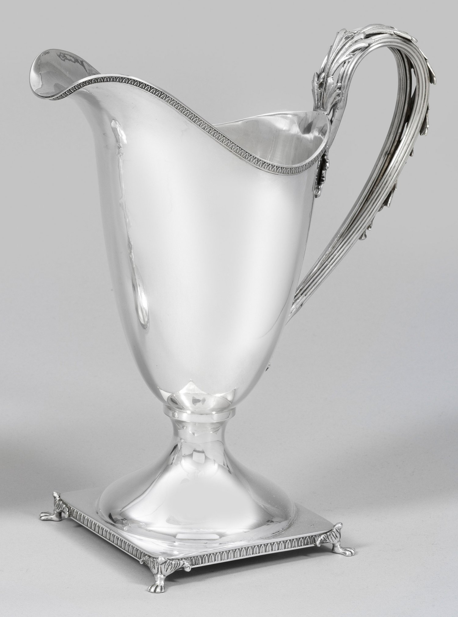 Silber. Von vier stilisierten Tatzenfüßen getragener, quadratischer Sockel, übergehend in trompetenförmig aufsteigenden Stand und helmförmigen Korpus mit hochgezogenem Ausguss. Seitlicher Ohrenhenkel, bestehend aus zwei Streben in reliefplastischem Blattwerk endend sowie mit korrespondierenden Blattranken verziert. Kannen- und Sockelrand umzogen von feinem Lanzettblattfries. Undeutl. gest.; Gew. ca. 880 g. H. 30,4 cm.