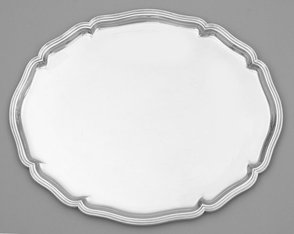 Silber. Ovale Form. Flacher, glatter Spiegel, übergehend in leicht ansteigende Fahne und blütenförmig geschweiften, mehrfach profilierten Rand. Gest. 800, Herstellerzeichen. Gew. ca. 2170 g. 54 cm x 43,5 cm.