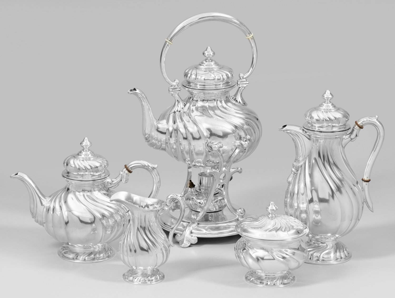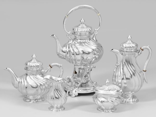 Silber. 5-tlg.; Heißwasserkanne mit Rechaud, Kaffee- und Teekanne, Sahnegießer, Zuckerdose. Über ausgestelltem Rundstand gedrückt bauchiger sowie birnförmiger Korpus. Wandung umlaufend von vertikalen, geschwungenen Zügen gegliedert. Korrespondierender, haubenartiger Scharnierdeckel mit Balusterknauf. Gest. 800, Herstellerzeichen. Gew. zus. ca. 3455 g. H. 13 cm - 40 cm.