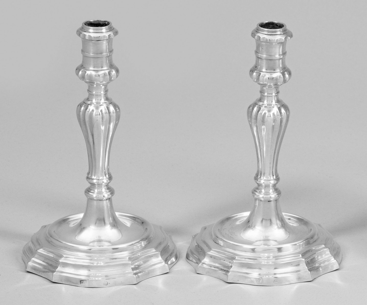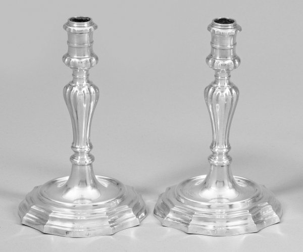 Silber. Runder, mehrfach getreppter und von vertikalen Zügen gegliederter Stand mit Wulstring. Kurzer, konischer Balusterschaft in zylindrischer Tülle endend. Auf dem Stand graviertes Monogramm "G.F". Gest., mehrfache Tremolierstriche, unbekanntes Beschauzeichen, Meisterzeichen "BV". Gew. zus. ca. 645 g. H. 19,5 cm.