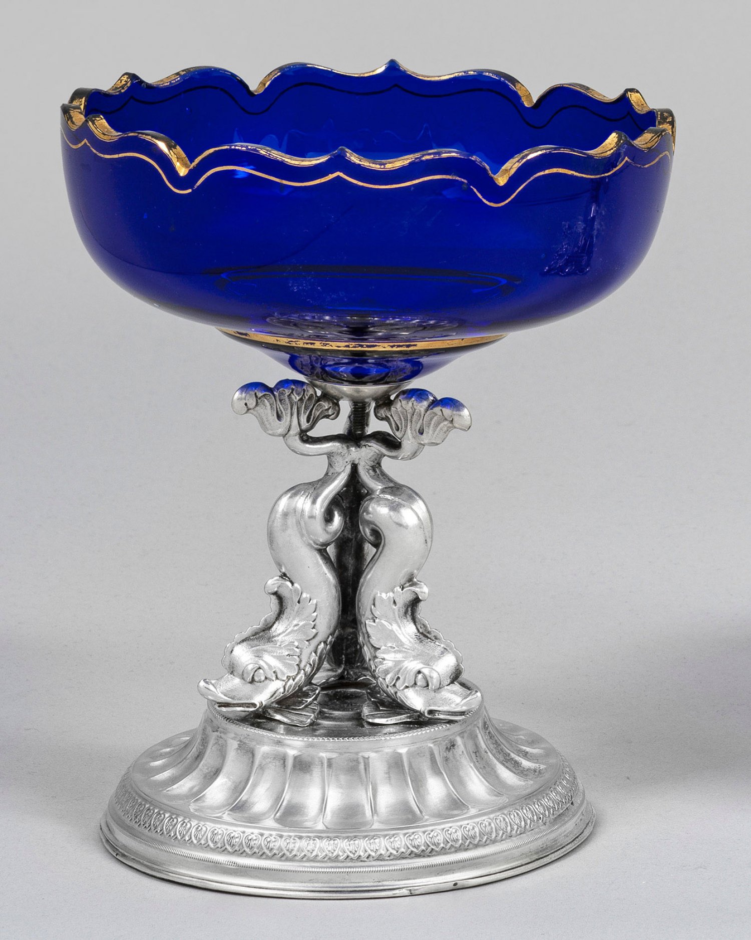 Silber und kobaltblaues Glas. Runder, mittig aufsteigender Stand, umzogen von zungenförmigen Kanneluren und stilisiertem Blattfries, beschwert. Schaft in Gestalt von drei vollplastisch gearbeiteten Delphinen, ihre Flossen als Träger für eine runde, verschraubte Glasschale mit goldbemaltem, passig geschweiftem Rand. Die Gegenschraube im Schaleninneren mit dat. Widmung "M & L d. 22. April 1849". Gest. 12 Lot, Beschauzeichen, Meister Johann George Wilhelm Peters (wird Bürger 1821). Ges.-Gew. ca. 600 g. H. 17,5 cm.