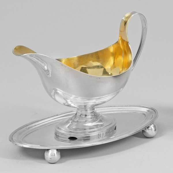 Silber. Vier Kugelfüße mit montierter, ovaler Platte. Schiffchenförmiger Korpus mit ausgezogenem Ausguss und Bandhenkel. Innen vergoldet. Gest., Beschauzeichen, Garantiestempel Königreich der Niederlande für 833 Silber (1814 - 1831), Meister wohl Karel-Philip Ovyn (tätig 1. Drittel 19. Jh.). Gew. ca. 515 g. H. 15,5 cm. 21,5 cm x 11,5 cm.
