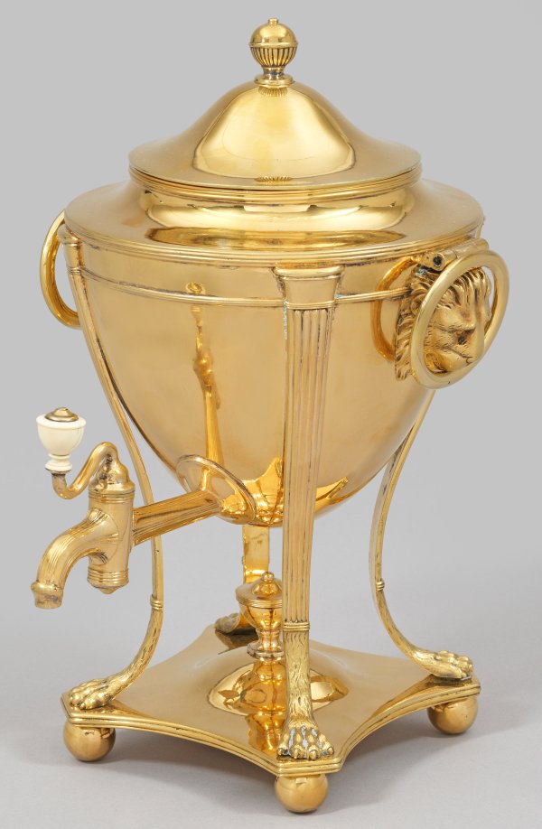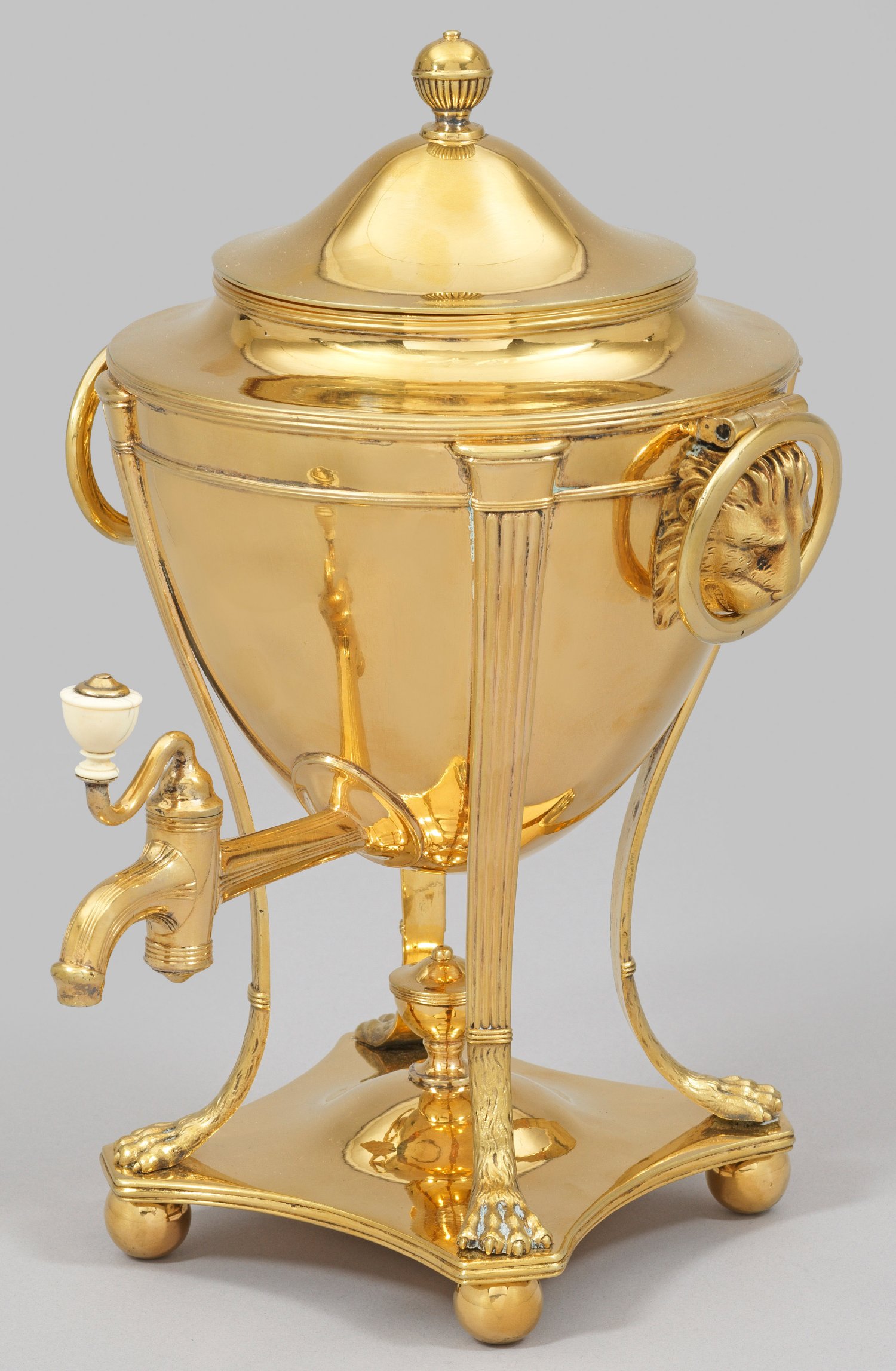 Silber, voll vergoldet. Vier Kugelfüße als Träger für quadratische Bodenplatte mit konkav eingezogenen Seiten. Zentrale Darstellung einer stilisierten Deckelvase, umgeben von vier godronierten, aufsteigenden Säulen, in fein ziselierten Löwenfüßen mündend. Gerundeter, stark konischer, glatter Korpus mit abgesetzter Schulter. Seitliche, reliefplastische Löwenköpfe mit scharnierten Trageringen. Schauseitiger, gerader Ausgußsteg mit Zapfhahn und Elfenbein-Balusterknauf. Aufgewölbter Steckdeckel mit Kugelknauf. Innen mit Einsatz und Deckelchen. Gest., Tremolierstrich, Beschauzeichen, Meister Hermann Gottlieb Unger (wird Meister 1799), französische Importmarke von 1893. Gew. ca. 2750 g. H. 29 cm.