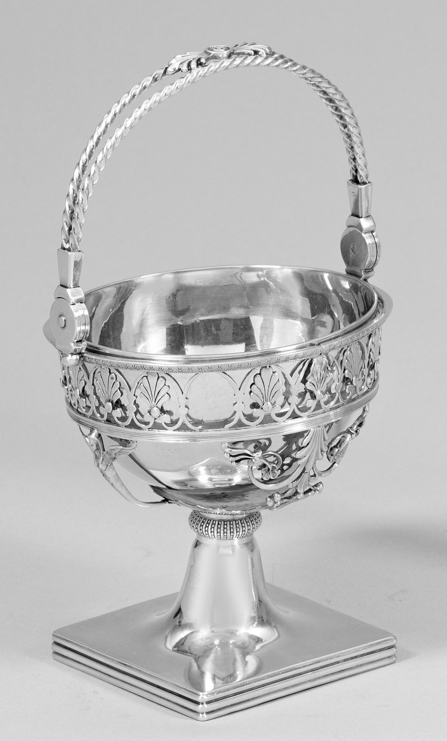 Silber. Quadratische, am Rand von Profillinien umzogene Plinthe, übergehend in kurzen, sich verjüngenden Schaft und halbrunden Korpus. Aus schmalen Streben filigran gestaltete Wandung in Form von durchbrochen gearbeiteten Blatt-, Blüten- und Zierornamenten. Glatte, halbkugelige Silberschale als Einsatz. Scharnierter, übergreifender Henkel aus zwei Kordelbändern. Obenauf ein appliziertes Palmettenblattornament. Minim. besch.; Gest., Beschauzeichen von 1793-1798, Meister Marc Jacquait/Jacquart (tätig seit 1797). Gew. ca. 635 g. H. 23 cm. D. 13 cm.