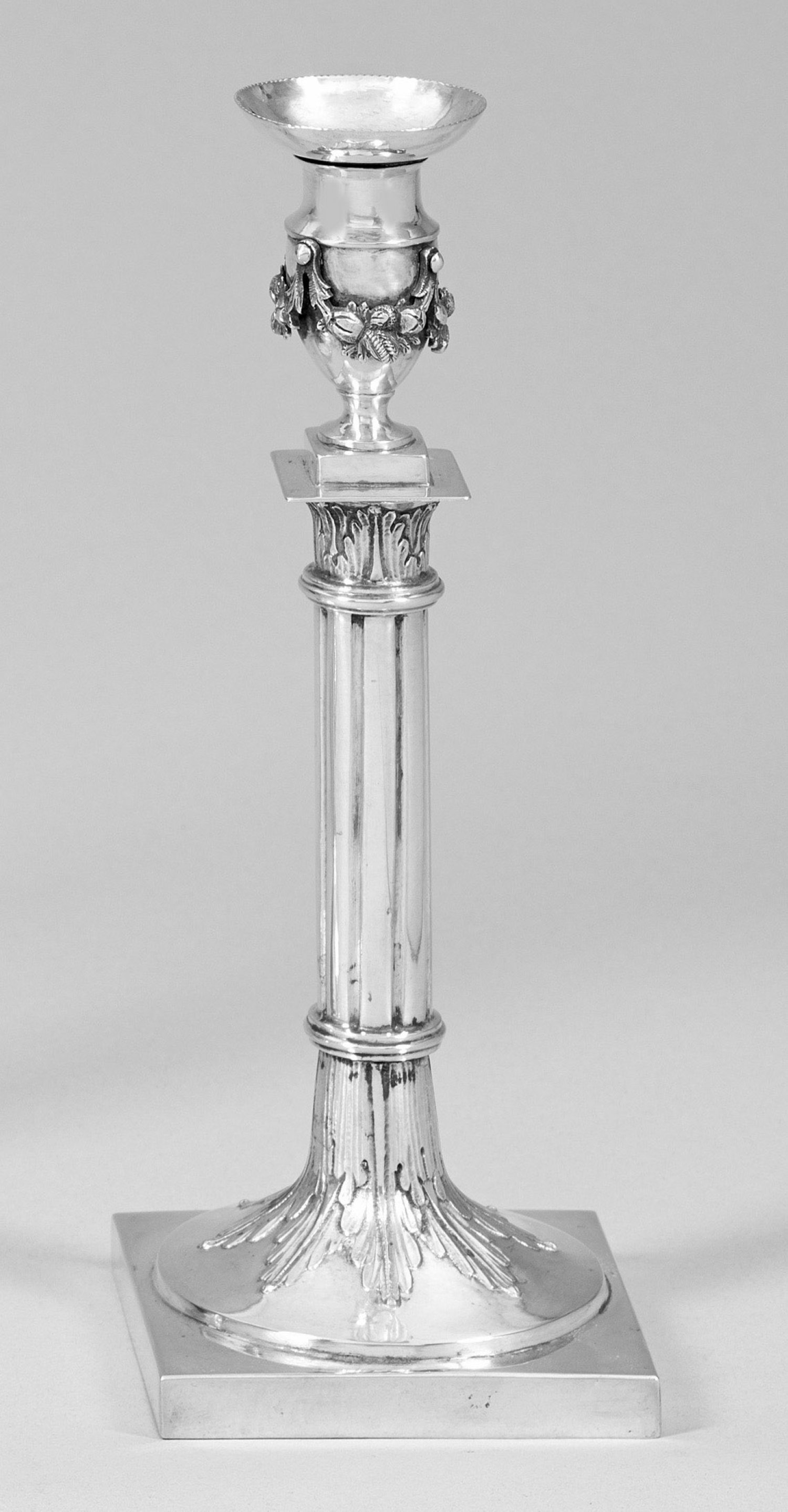 Silber. Quadratische Plinthe mit rundem, aufgewölbtem Stand, umzogen von sternförmiger Blattrosette, übergehend in hohen, kannelierten Schaft. Von einer flachen Plinthe getragene Tülle in Form einer Vase, umzogen von reliefplastischen Fruchtfestons. Gest. 12 Lot mit Beschauzeichen, Tremolierstrich, Meister Anton Friedrich Burgmüller (wird Meister 1797). Gew. ca. 235 g. H. 21,5 cm.