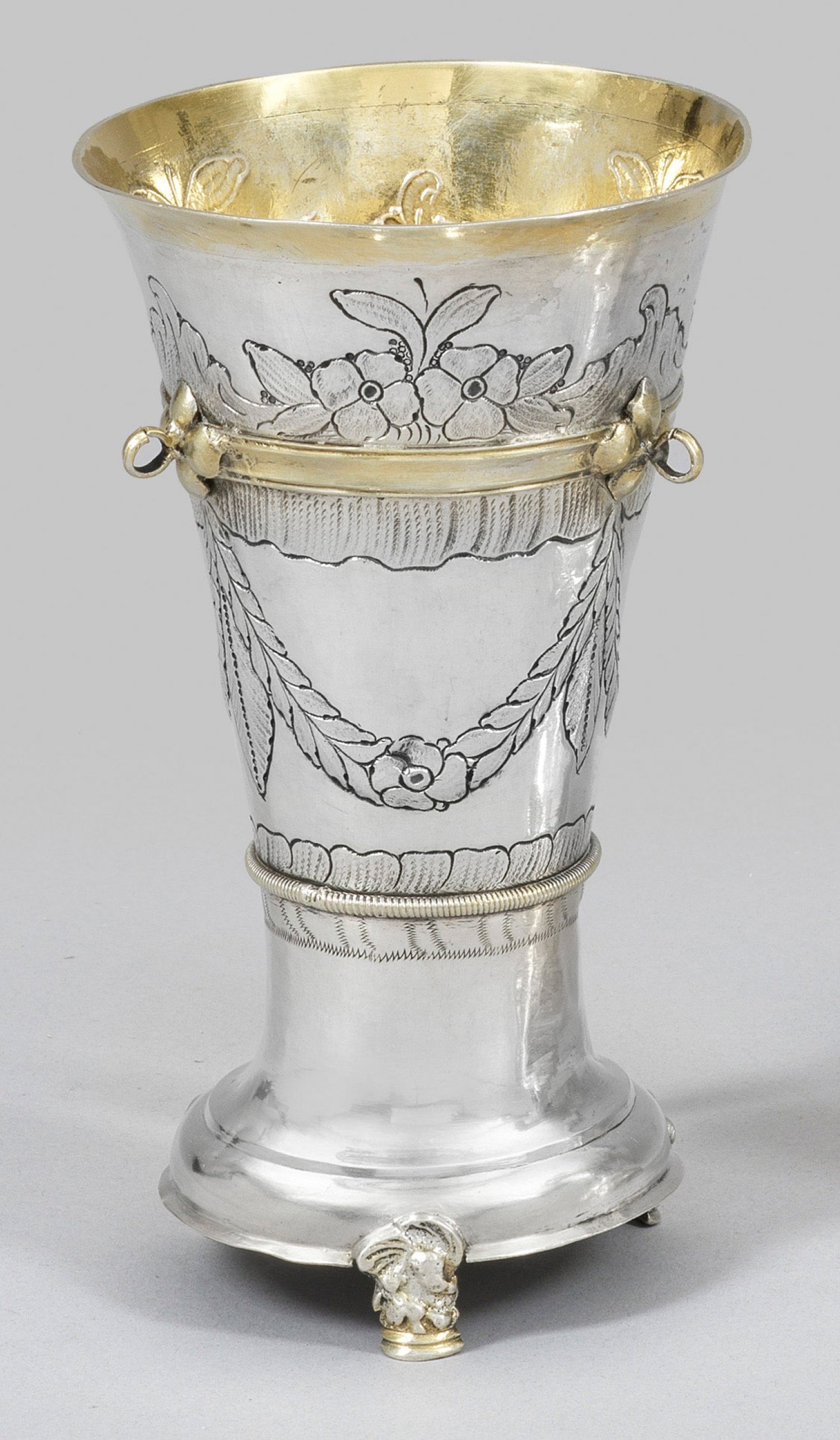 Silber, teilw. vergoldet. Über drei Füßen runder gewölbter Stand in konischen Hohlschaft übergehend. Wandung verziert mit zwei aufgelegten, profilierten Bändern, besetzt mit drei Rosetten mit Ringösen sowie verziert mit Blütenfestons. Innen vergoldet. Gest., Beschauzeichen mit undeutl. Dat., unbekanntes Meisterzeichen, Wardein wohl Mathias Petersen (1796-1812), Monatsmarke Sternzeichen "Löwe". Gew. ca. 135 g. H. 14,5 cm.