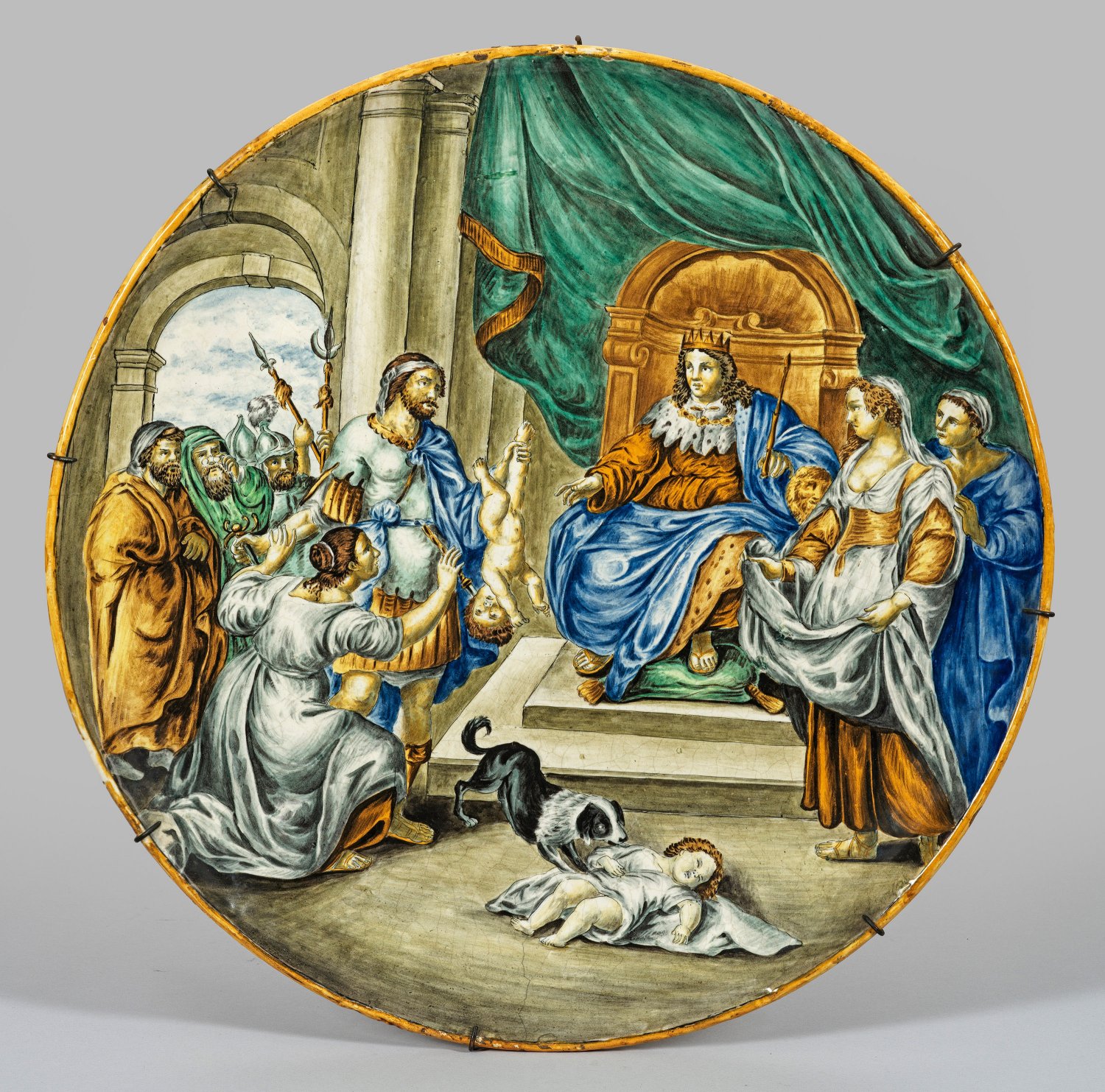 Majolika. Flache, wenig gemuldete, runde Platte auf Standring. Flächendeckender, polychromer Scharffeuerdekor mit vielfiguriger szenischer Darstellung der Erzählung aus dem ersten Buch der Könige des Alten Testaments (1. Könige, 3,16-28) mit dem thronenden jungen König und den zwei Frauen, die sich um ein Kind streiten. Hierbei blieb das Urteil des Salomo über die Jahrhunderte hinweg bis in die Neuzeit zugleich ein exemplarisches Beispiel für die Herrschertugenden Gerechtigkeit und Weisheit, mit dem sich die Regenten identifizieren konnten. Rand ger. best.; D. 62,5 cm.