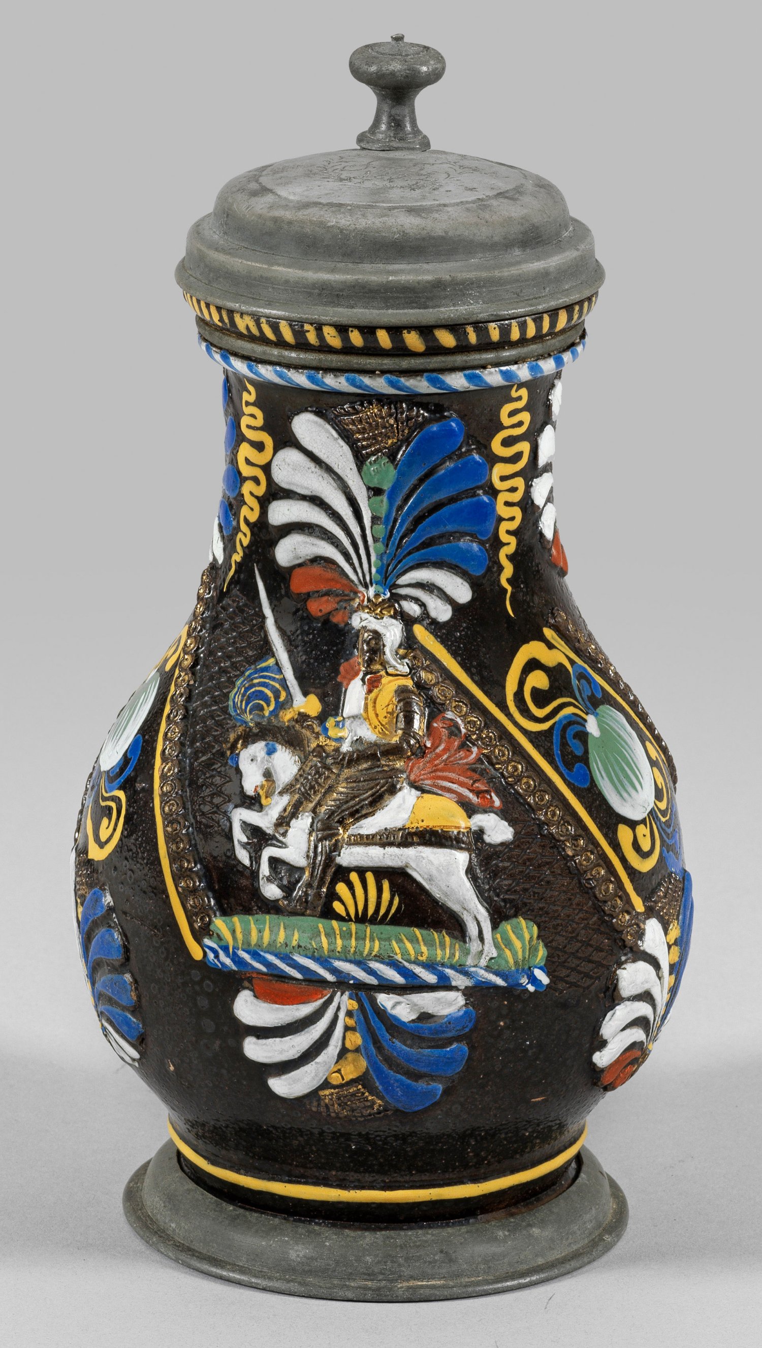 Sog. "Annaberger Krug". Steinzeug, dunkelbraunschwarz engobiert und salzglasiert. Aufgelegter und mit polychromen Emailfarben sowie Gold bemalter Dekor aus einem mit einem Schwert bewaffnetem, schweren Reiter in Harnisch, diagonalen Ornamentfriesen, stilisierten floralen Motiven, Palmetten und Trauben. Lippenrand rest.; Zinngefasster Stand, auf dem Zinndeckel graviertes Monogramm mit Dat. 1692. H. 24,5 cm.