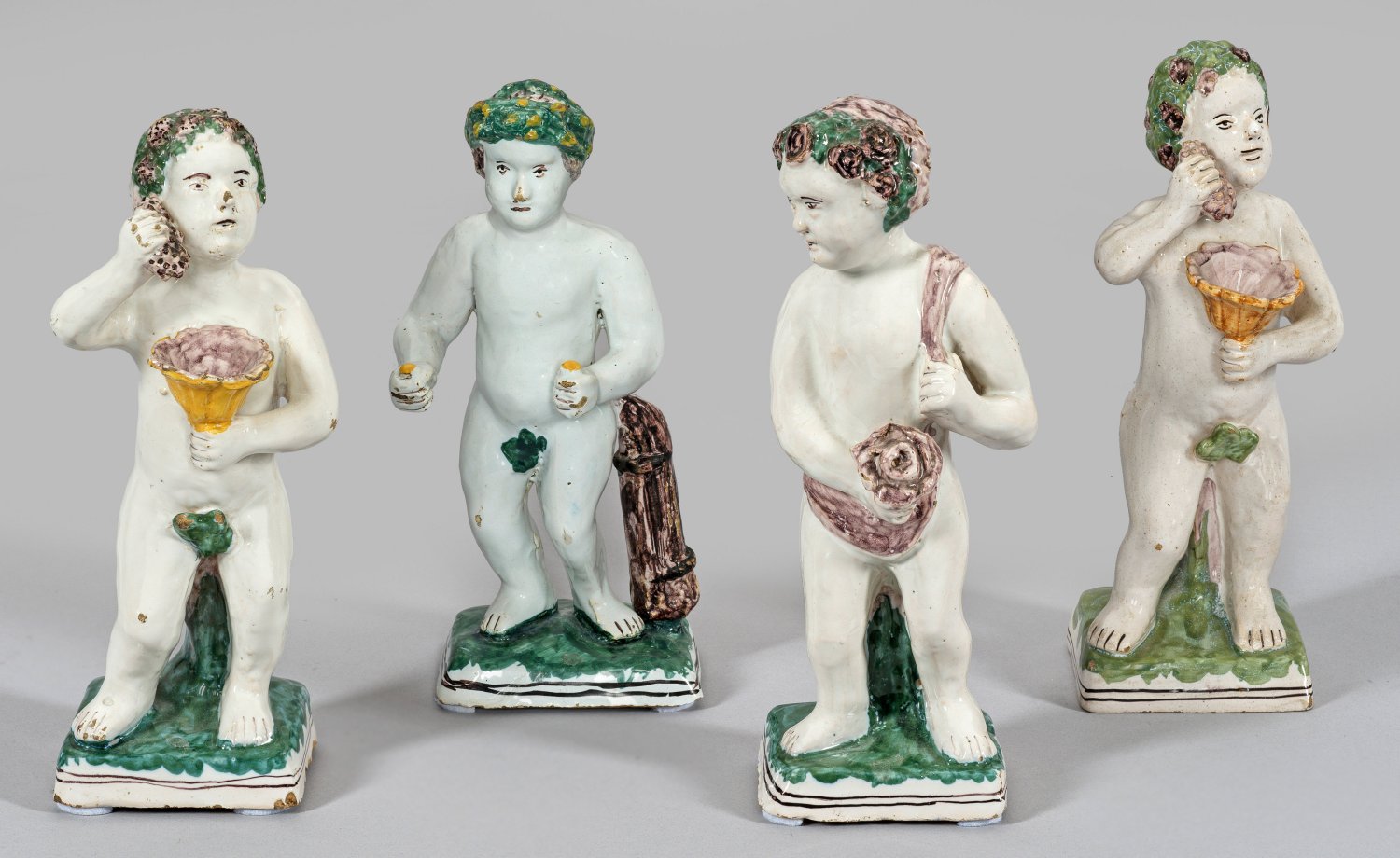 Fayence. Auf einer rechteckigen Plinthe stehende Putti mit Jahreszeiten-Attributen - Blumen für den Frühling, Weintrauben für den Herbst und Reisigbündel für den Winter. Polychrome Bemalung. Ger. best., gem. "B:P" bzw. "K" (mit Punkt darüber) in Dunkelmanganviolett und Schwarz. H. 24,5 cm-25,5 cm.