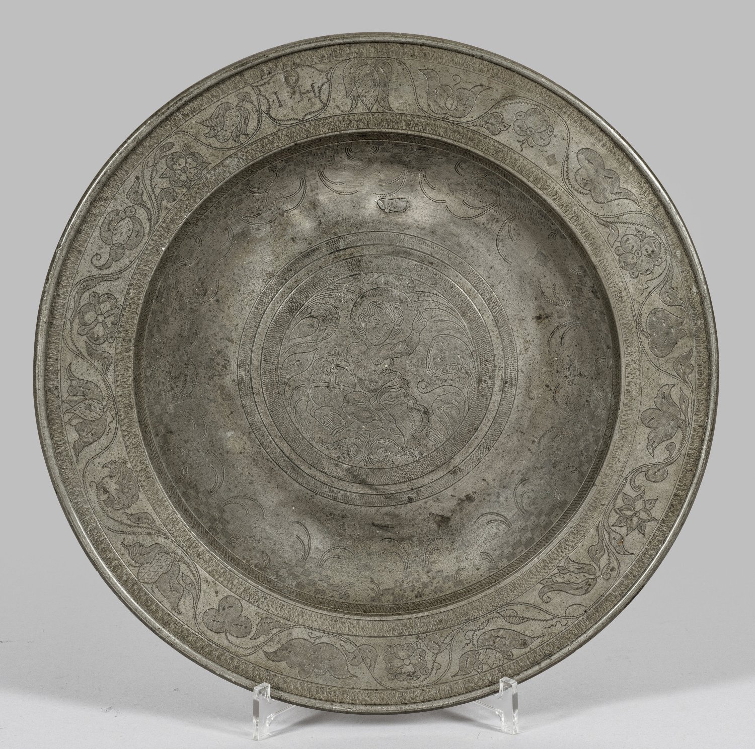 Runde Tellerform mit vertieftem Spiegel, darin mittig gravierte Darstellung des Jesusknaben, umrahmt und umgeben von mehreren floral ornamentierten Friesen an Spiegelrand und Fahne. Monogr. "I. H." Rücks. Hängeöse. Gest. unbekannte Meistermarke "CG". D. 37,5 cm.