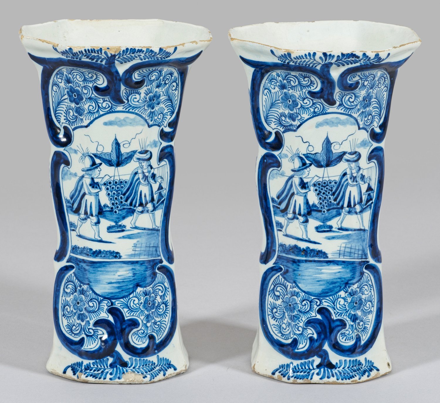 A pair of Dutch blue and white vases. Chips. Marked "AK".