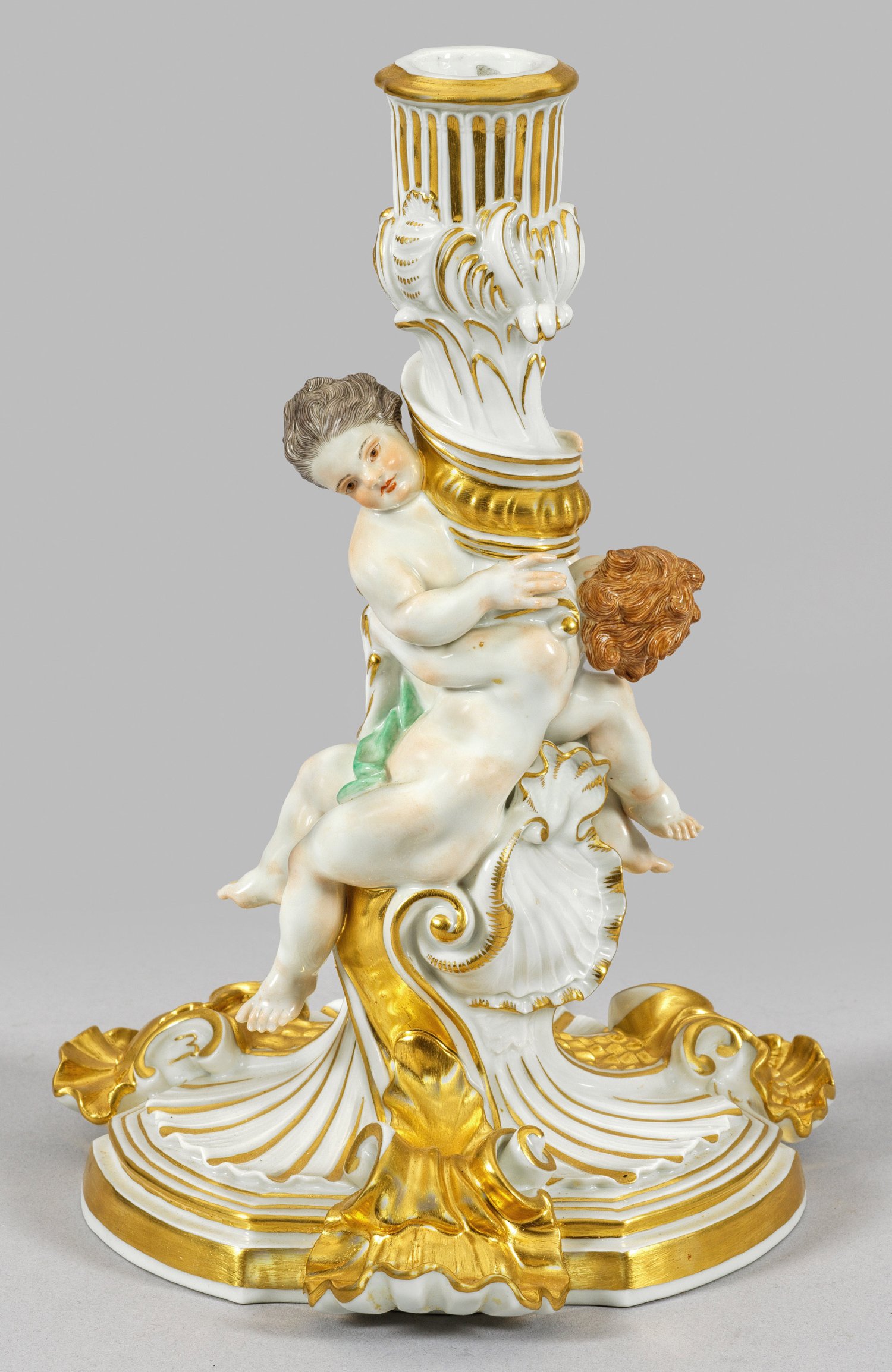 1-flg.; Aus dreiseitig geschweiftem, profiliertem Stand mit stark plastischen Muschelreliefs, volutenartig aufsteigender Schaft mit einem sich windenden Puttenpaar, in vasenförmige Tülle übergehend. Feine polychrome Malerei mit reicher Goldstaffage. Entw. Johann Joachim Kaendler und Johann Friedrich Eberlein, um 1739. Jahreszeichen. Schwertermarke. H. 24 cm.