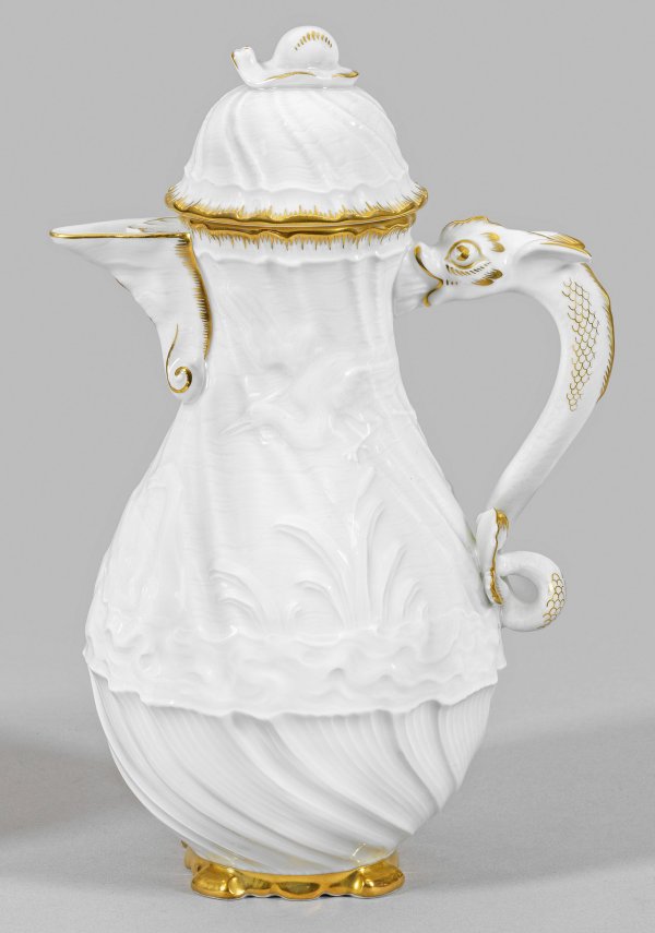 Birnförmiger Korpus mit aufgewölbtem Deckel, mittig plastischer Knauf in Gestalt einer Schnecke. Figürlicher Henkel als Delfin. Auf der Wandung feiner muschelförmiger Reliefdekor (Schwanendessin) aus zwei einander zugeneigten Schwänen, fliegendem und zwischen hohem Schilf stehendem Reiher. Gekämmte Goldkante und -staffage. Entw. nach Johann Joachim Kaendler und Johann Friedrich Eberlein. Schwertermarke. H. 26 cm.