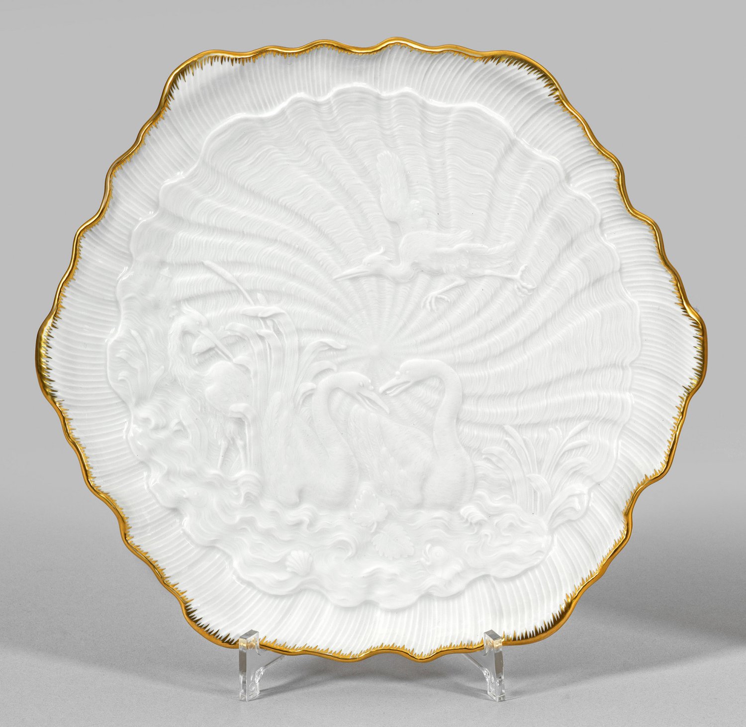 Runde, passig geschweifte, flach gemuldete Form. Im Spiegel feiner muschelförmiger Reliefdekor (Schwanendessin) aus zwei einander zugeneigten Schwänen, fliegendem und zwischen hohem Schilf stehendem Reiher. Gekämmte Goldkante. Entw. nach Johann Joachim Kaendler und Johann Friedrich Eberlein. Modell-Nr. 5506. Schwertermarke. D. 30,5 cm.