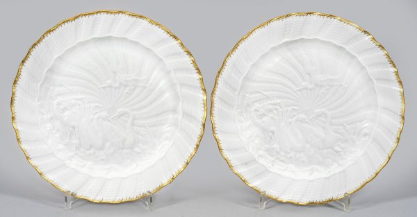 A pair of porcelain plates with "swan service" decor. Crossed swords mark.