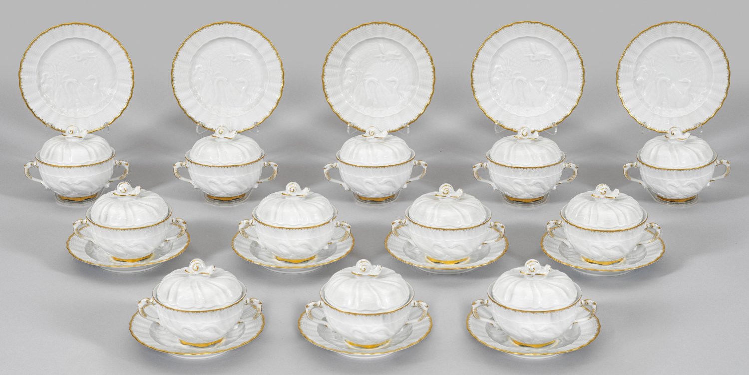 mit 12 dazu passenden Tellern. 24-tlg.; Halbkugeliger Korpus mit seitlichen Delfinhenkeln. Passig gewölbter Deckel mit plastischer Bekrönung in Gestalt einer Schnecke. Feiner, muschelartiger Reliefdekor (Schwanendessin) mit zwei einander zugeneigten Schwänen, einem zwischen hohem Schilf stehendem Reiher, darüber fliegender Fischreiher. Entw. Johann Joachim Kaendler und Johann Friedrich Eberlein. Modell-Nr. (Teller) 5470. Teilw. gekämmte Goldkante und Goldstaffage. Partiell. minim. best.; Schwertermarke. D. 11 cm.