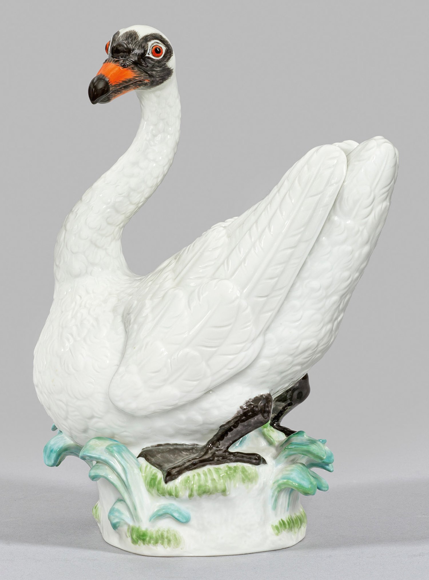 Auf naturalistisch staffiertem Sockel zwischen Schilfbüscheln sitzender Schwan mit aufgerichtetem Hals, nach links gerichtetem Kopf und naturgetreuem, reliefiertem Gefieder. Polychrome Malerei. Entw. Johann Joachim Kaendler. Modell-Nr. 77150. Brandrisse. Schwertermarke. H. 21,5 cm.