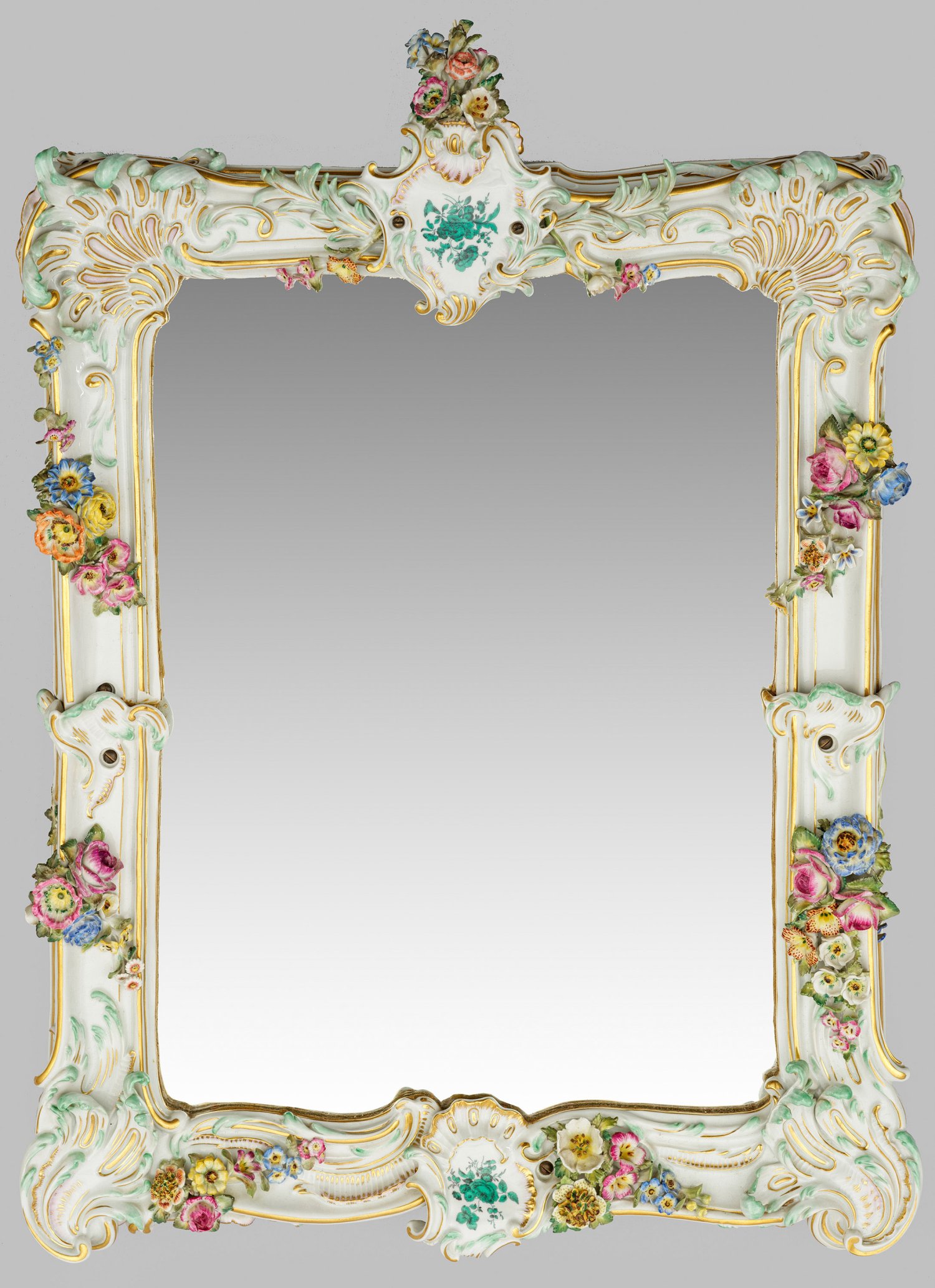 A large prestigious porcelain wall mirror with applied flower decoration. Insignificantly chipped. Crossed swords mark.