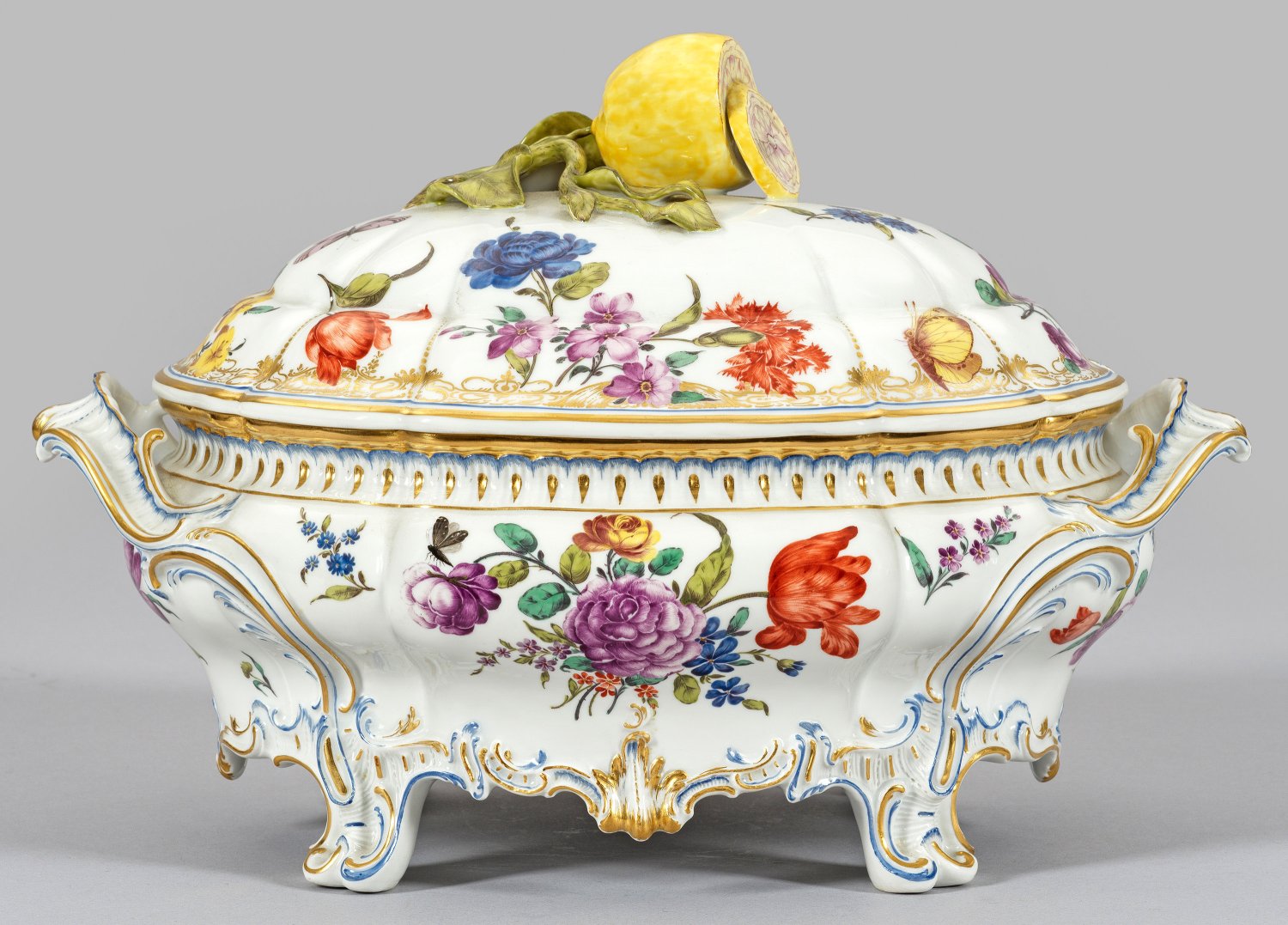 Über vier Volutenfüßen ovaler, gedrückt bauchiger Korpus mit mehrfacher Godronierung, faconniertem Rand und seitlich aufsteigende Blattvolutenhenkel, umzogen von rocailleförmigem Reliefdekor. Getreppter, aufgewölbter Deckel mit plastischem Knauf in Gestalt einer angeschnittenen Zitrone. Umlaufend aufwändig gestaltete, große, farbenprächtige Blumenbuketts (sog. "Nymphenburger Bukett") sowie vereinzelte, gestreute Blumengebinde, begleitet von Schmetterlingen und Käfern. Feine, polychrome Malerei nach Joseph Zächenberger mit breiten Goldspitzenbordüren und reicher Goldstaffage. Manufakturmarke. H. 25 cm. 36,5 cm x 23,5 cm.