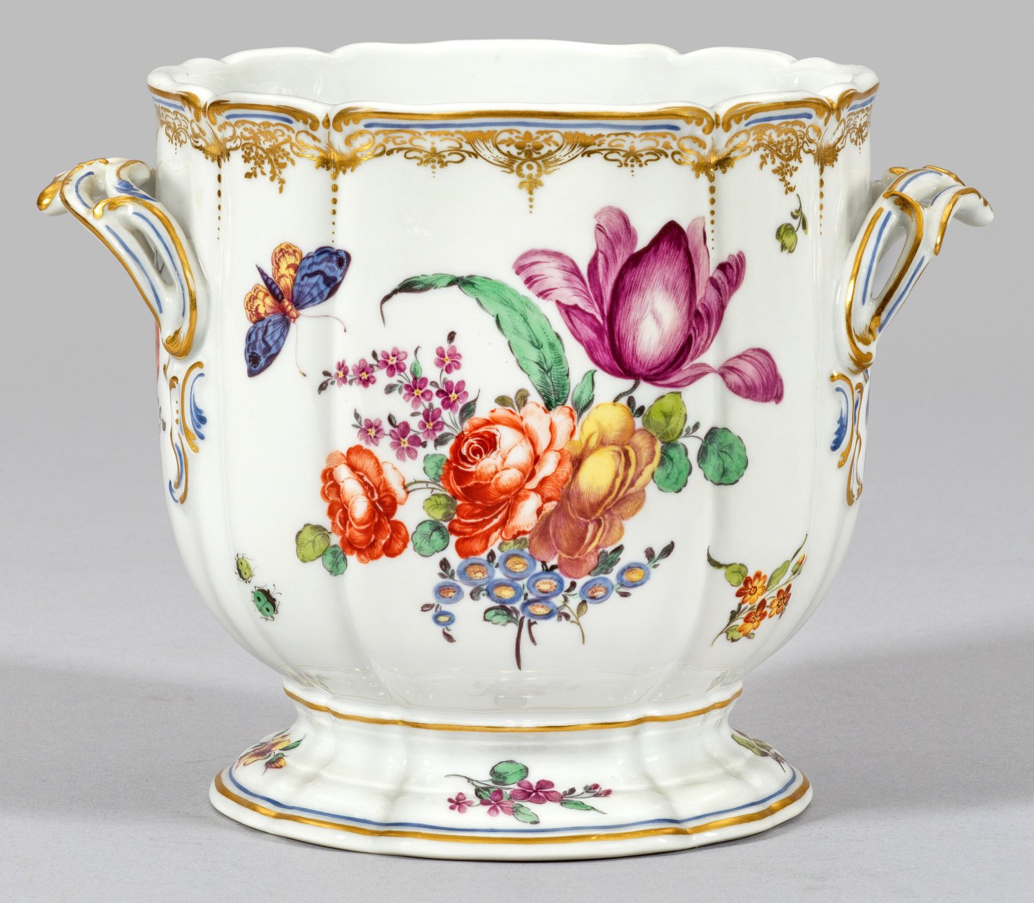 Über dem Rundstand gewölbter, kelchförmiger, allseits durch faconnierte Grate gegliederter Korpus mit seitlich durchbrochen gearbeiteten, volutenförmige Handhaben. Form "Rokoko", Dekor sog. "Cumberland". Beidseitig der Wandung farbenprächtiges, sog. "Nymphenburger Bukett", umgeben von gestreuten Blütenzweigen und großem Schmetterling. Leuchtend polychrome Malerei nach Joseph Zächenberger mit feiner Goldornamentbordüre. Maler-Monogr.; Manufakturmarke. H. 16 cm.