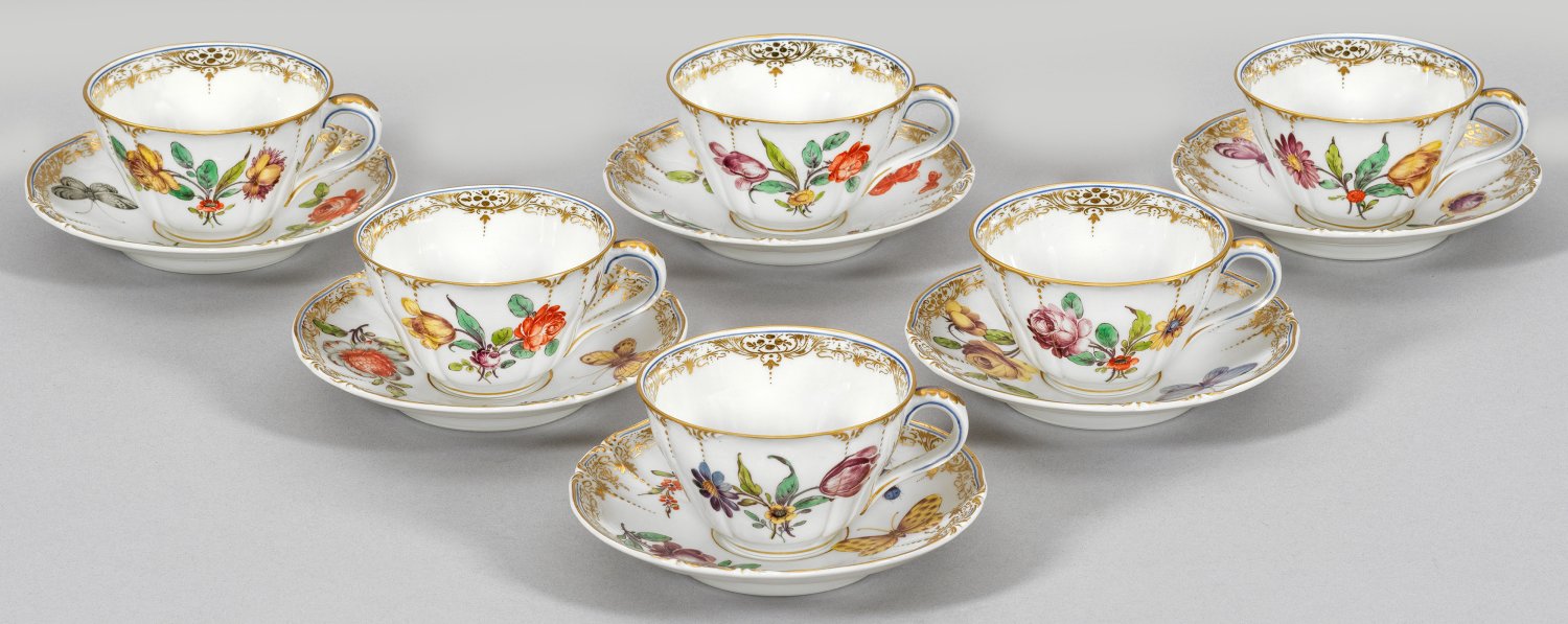 A set of six porcelain tea cups and saucers with decor "Cumberland", painted with flower arrangements after J. Zächenberger. Manufacturer's mark.