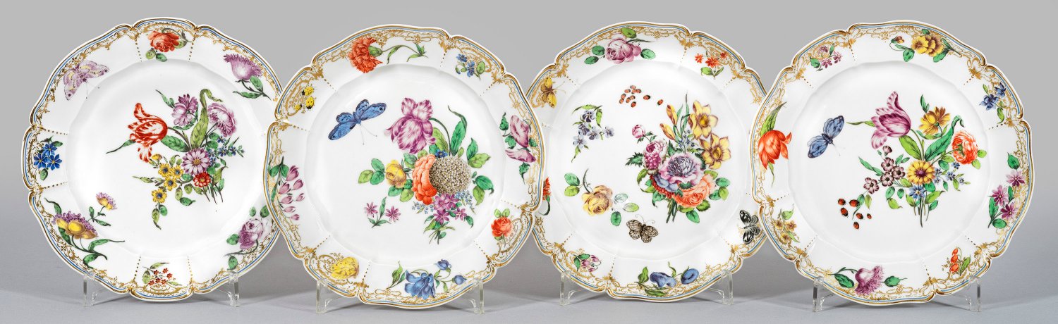 A set of four porcelain dinner plates with decor "Cumberland", painted with flower arrangements after J. Zächenberger. Partly rubbed. Manufacturer's mark.