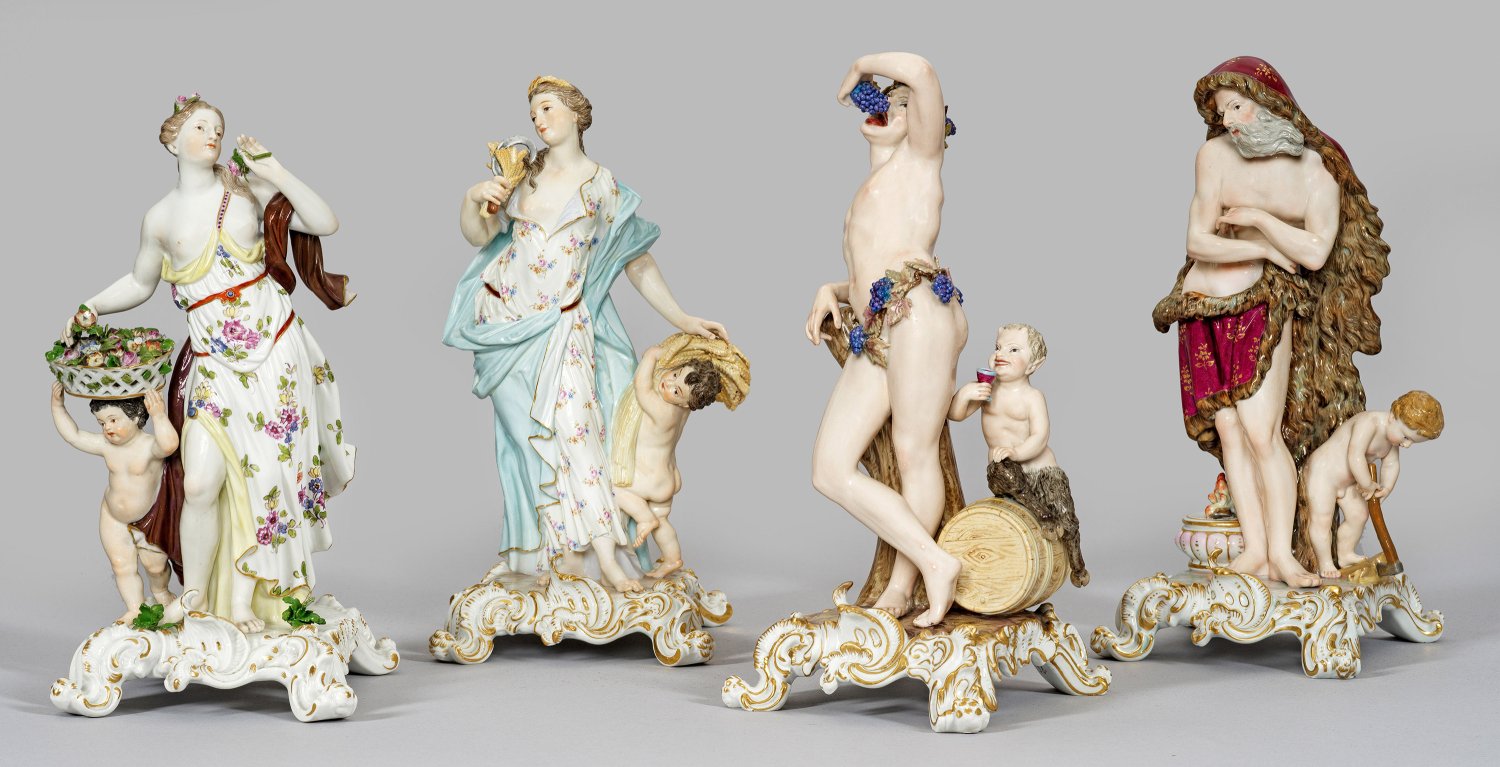 Auf vierfüßigen, rocaillierten Sockeln stehende Personifikationen der vier Jahreszeiten. Die Allegorie des Frühlings als junge Frau im langen, blumig gemusterten Gewand, an einer Blüte riechend und in Begleitung eines Kindes mit Blumenkorb. Die Allegorie des Sommers ähnlich gewandet, Sichel und Ährenbündel haltend, begleitet von einem Kind, das weitere Ähren trägt. Die Allegorie des Herbstes als von Weinranken umgürteter und bekrönter junger Mann, an einem Baumstamm lehnend neben auf Weinfass sitzendem Satyrkind. Die Allegorie des Winters als bärtiger, sich am lodernden Feuer wärmender Greis in pelzgefüttertem Gewand, in Gesellschaft eines holzhackenden Knaben. Polychrome Malerei mit Goldkonturierung. Entw. Johann Friedrich Eberlein. Modell-Nr. 669, 674, 688 und 691. Unw. rest./Minim. best.; Schwertermarke. H. 28 cm - 29 cm.