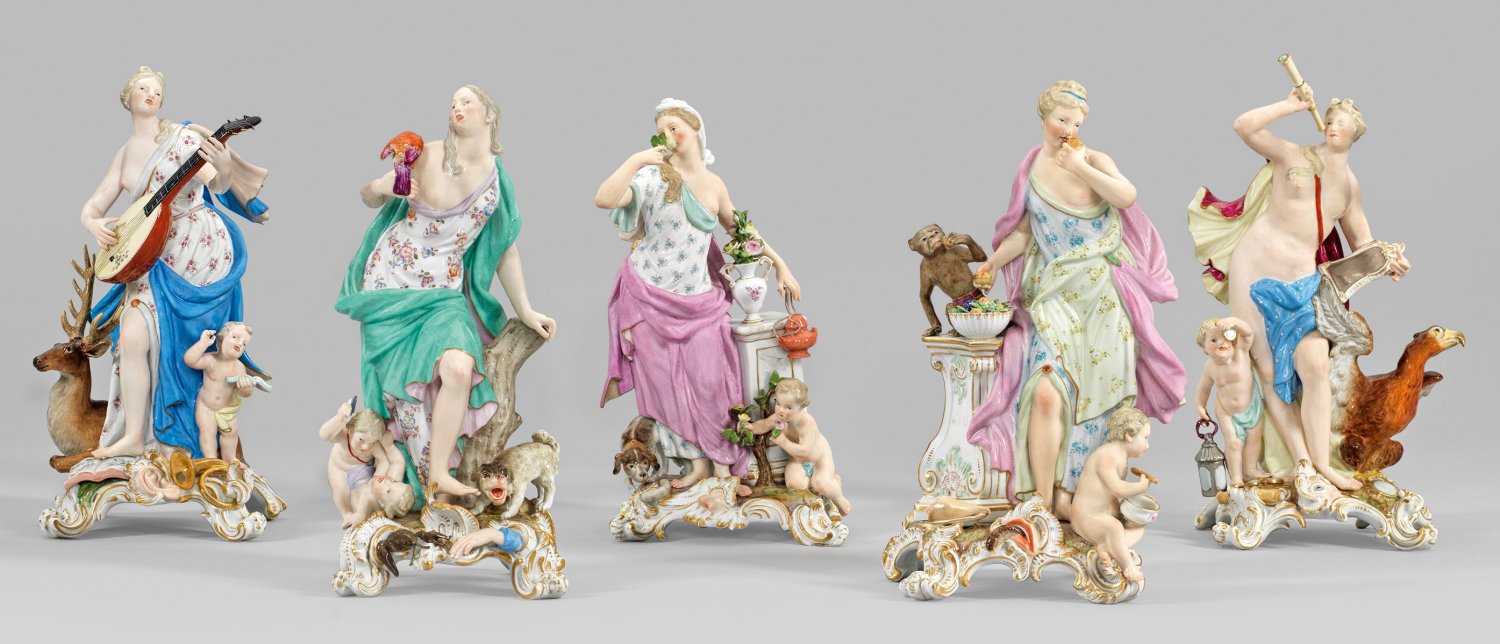 5-tlg.; Auf rocaillereliefierten Sockeln stehende junge Frauen in antikisierenden Gewändern, begleitet von Putten bzw. Tieren sowie mit Beifügung verschiedener Attribute. Die Laute spielende Personifikation des Gehörs mit Notenblättern und Waldhorn, flankiert von einem liegenden Hirsch bzw. des Sehens mit Fernrohr, Spiegel, Brille und begleitendem Adler. Die Personifikation des Geschmacks mit Äpfeln und Trauben, flankiert von einem Affen, der sich aus einer gefüllten Obstschale bedient bzw. gelehnt an eine Säule die stehende Personifikation des Geruchs mit Rosenstrauch und -blüten sowie einem Potpourrigefäß und die Allegorie des Gefühls mit Papagei, Puttenpaar und Hund. Polychrome Malerei mit reicher Goldstaffage. Entw. Johann Friedrich Eberlein. Modell-Nr. 1035, 1042, 1051, 1062, 1136. Unw. rest und best.; Teilw. Brandrisse. Schwertermarke. H. 27 cm - 28 cm.