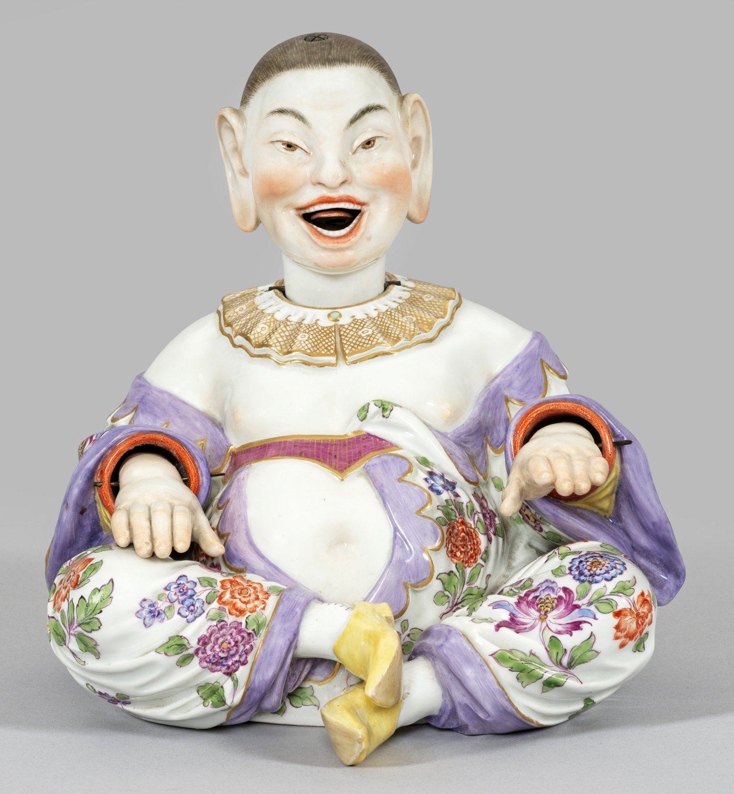 Mit verschränkten Beinen sitzender, dickbäuchiger Chinese in einem weißen, von großen Indianischen Blüten gemusterten Gewand mit fliederfarbenem Innenfutter, purpurfarbenem Gürtel, spitzengesäumtem, weißem Kragen sowie gelben Pantoffeln. Hände, Kopf und Zunge beweglich. Polychrome Malerei mit Goldstaffage. Entw. Johann Joachim Kaendler. Modell-Nr. 156. Rest.; Haarriss. Schwertermarke. H. 18 cm.