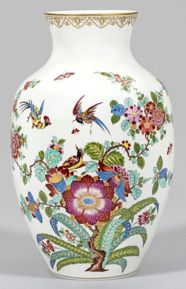 Balusterförmiger Korpus mit gerundeter Schulter, konvex einschwingendem Hals und leicht ausgestelltem Rand. Beidseitig der Wandung großflächig angelegter, farbenprächtiger Indianischer Blumendekor im Kakiemonstil nach Johann Ehrenfried Stadler. Auf der Schauseite blühende Päonienstaude mit aufsteigenden, sich verzweigenden Chrysanthemen- und Prunuszweigen, umgeben von exotischen Vögeln und Schmetterlingen. Rücks. korrespondierende Darstellung mit Indianischen Blütenzweigen. Feine goldgehöhte Malerei. Goldstaffage. Modell-Nr 50430. Schwertermarke. H. 42,5 cm.