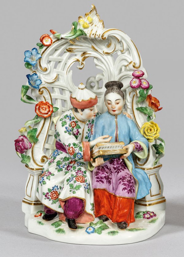 In gitterförmig durchbrochen gearbeiteter, von plastisch aufgelegten Blatt- und Blütenranken umzogener Laube sitzendes Liebespaar in festlicher, ornamentierter Kleidung. Polychrome Malerei mit Goldstaffage. Entw. Peter Reinicke. Modell-Nr. 65640. Minim. best.; Schwertermarke. H. 18,5 cm.