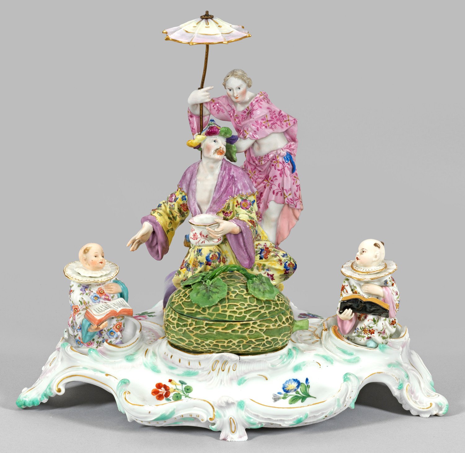 5-tlg.; Dreipassiges, auf Volutenfüßen stehendes Tablett mit zentraler Figurengruppe. Auf einem Kissen sitzender Chinese mit geöffnetem Topf. Hinter ihm stehende Dienerin, einen schützenden Palmschirm aus Messing und Porzellan haltend. Flankierende Chinesenknaben in Kimonos mit Indianischen Blüten als Tinten- bzw. Streusandgefäß. Mittige Deckeldose in Gestalt einer Frucht mit gekordeltem Blatthenkel. Reliefierter Rocaille- und Streublumendekor. Polychrome Malerei mit Goldstaffage. Entw. wohl Friedrich Elias Meyer, überarbeitet von Johann Joachim Kaendler und Peter Reinicke. Partiell rest./best.; Unw. ber.; Schwertermarke. Schreibzeug 35 cm x 24,5 cm. Gruppen-H. 25 cm. Gesamt-H. 30,5 cm.