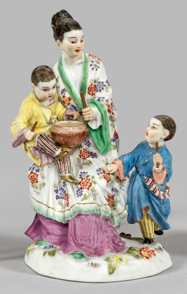 Auf Felssockel sitzende Japanerin mit Trommel schlagendem Kind auf dem Schoß, von hinten ein sich annäherndes weiteres Kind mit Trommelstock in der Hand. Polychrome Malerei mit wenig Gold. Entw. Johann Joachim Kaendler. Modell-Nr. 2679. Minim. rest./best.; Schwertermarke. H. 15 cm.
