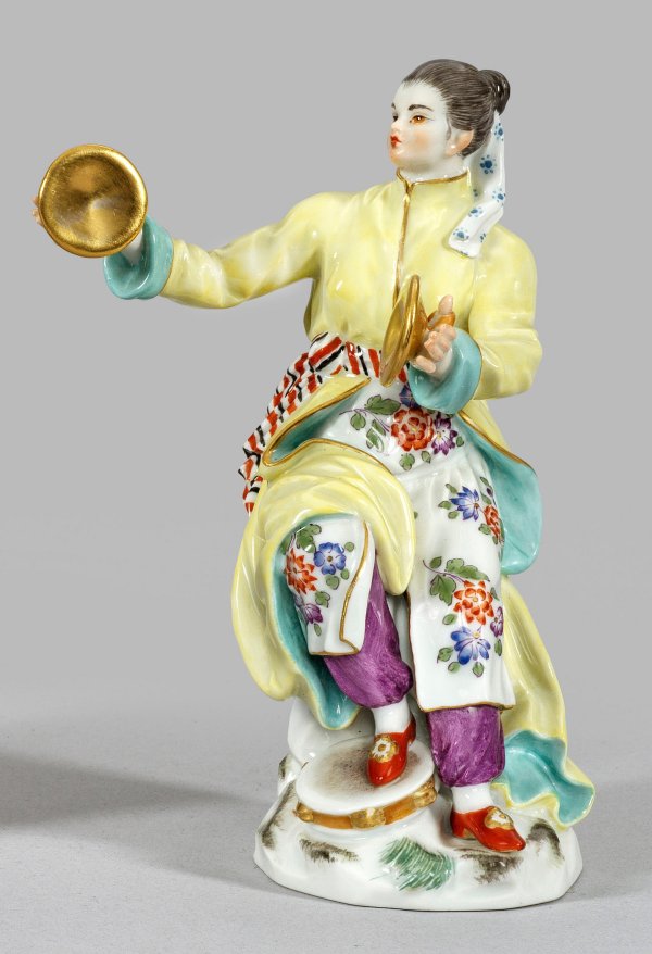 Auf Terrainsockel sitzende Japanerin, Zimbeln schlagend. Polychrome Malerei mit reicher Goldstaffage. Entw. Friedrich Elias Meyer. Modell-Nr. 65665. Schwertermarke. H. 13,5 cm.
