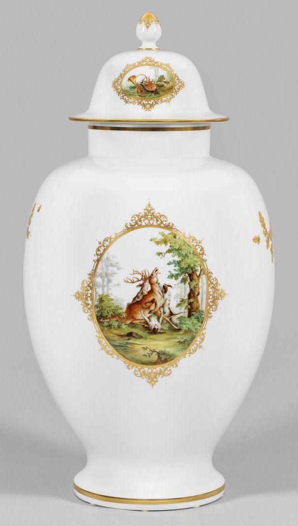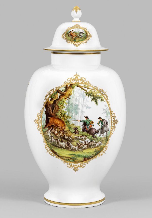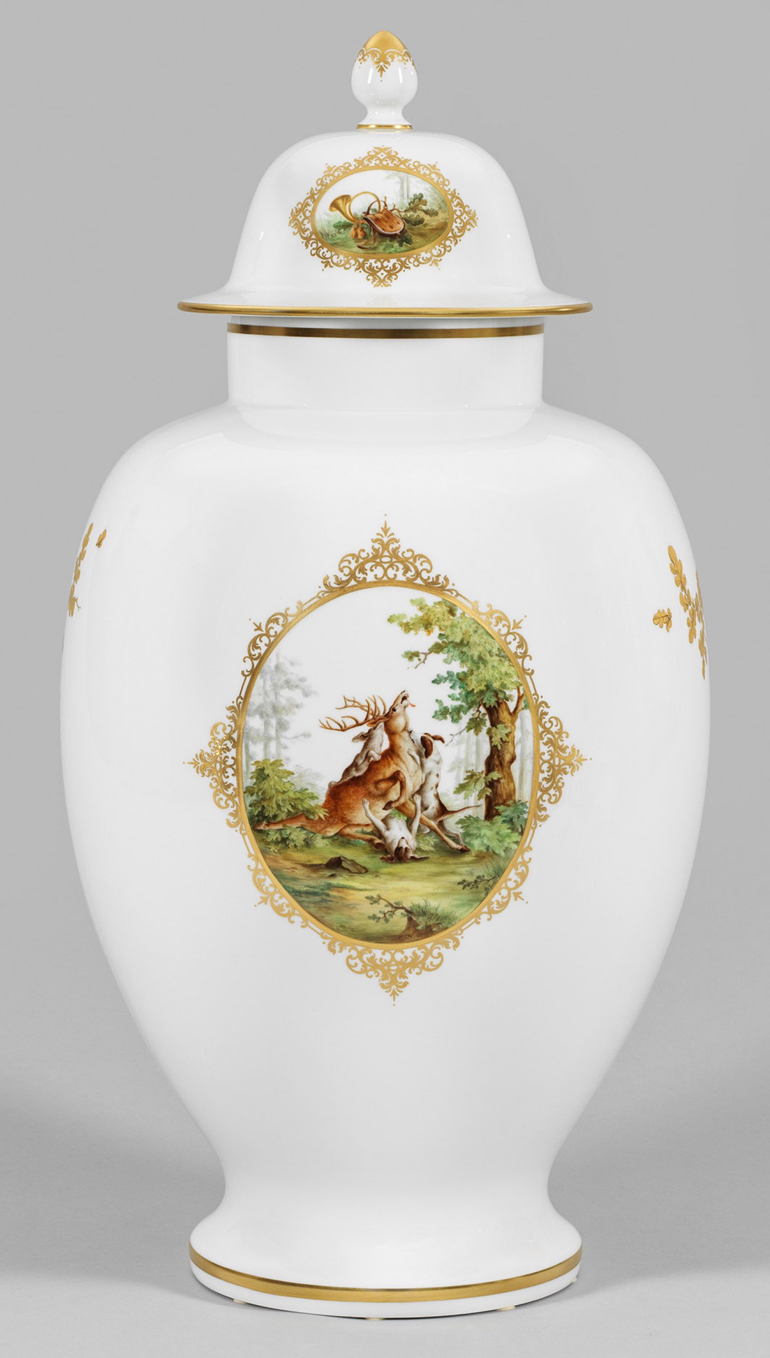 Über ausgestelltem Rundfuß ovoider Korpus mit gerundeter Schulter und abgesetztem, kurzem Hals. Haubenartig aufgewölbter, überkragender Deckel mit goldornamentiertem Zapfenknauf. Beidseitig der Wandung und auf dem Deckel goldkonturierte, von Laubwerk umzogene Ovalreserven mit Hirschhatz-Szenen vor Waldkulisse nach Johann Elias Ridinger. Auf der Schauseite großflächig angelegte, szenische Darstellung von Parforcejägern zu Pferd sowie Meute von Jagdhunden, einen Rothirsch stellend. Nach Vorlage von Ridinger's Kupferstich "Der Hirsch stellt sich, und kämpft die Hunde ab!" (SKD, Kupterstich-Kabinett, Inv.-Nr. A 12282). Rückseitig wiedergegebene Szene mit einem von Hunden niedergestrecktem Hirsch. Dazwischen ein großer Eichenlaubzweig in mattem Gold mit fein radierter Binnenzeichnung. Der Deckel mit korrespondierender Szene sowie jagdliches Motiv mit Waldhorn und Jagdtasche. Polychrome Malerei. Modell-Nr. 51115. Schwertermarke. H. 64 cm.