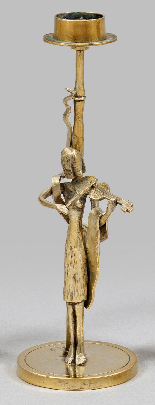Silber, voll vergoldet. Über runder Plinthe mittig aufsteigender, gering balustrierter und mehrfach gegliederter Schaft, bekrönt von zylindrischer Tülle über ausgestelltem Rand. Vor dem Schaft die abstrakt skulpturale und feingliedrige Darstellung einer Geigenspielerin. Um die Schulter und den Schaft ein stolaähnlich geschwungenes, zartes Band. Auf der Bodenunterseite bez. "Zeitner Lüneburg". Gest. 830, Meisterzeichen "HZ". Gew. ca. 180 g. H. 15,7 cm.
