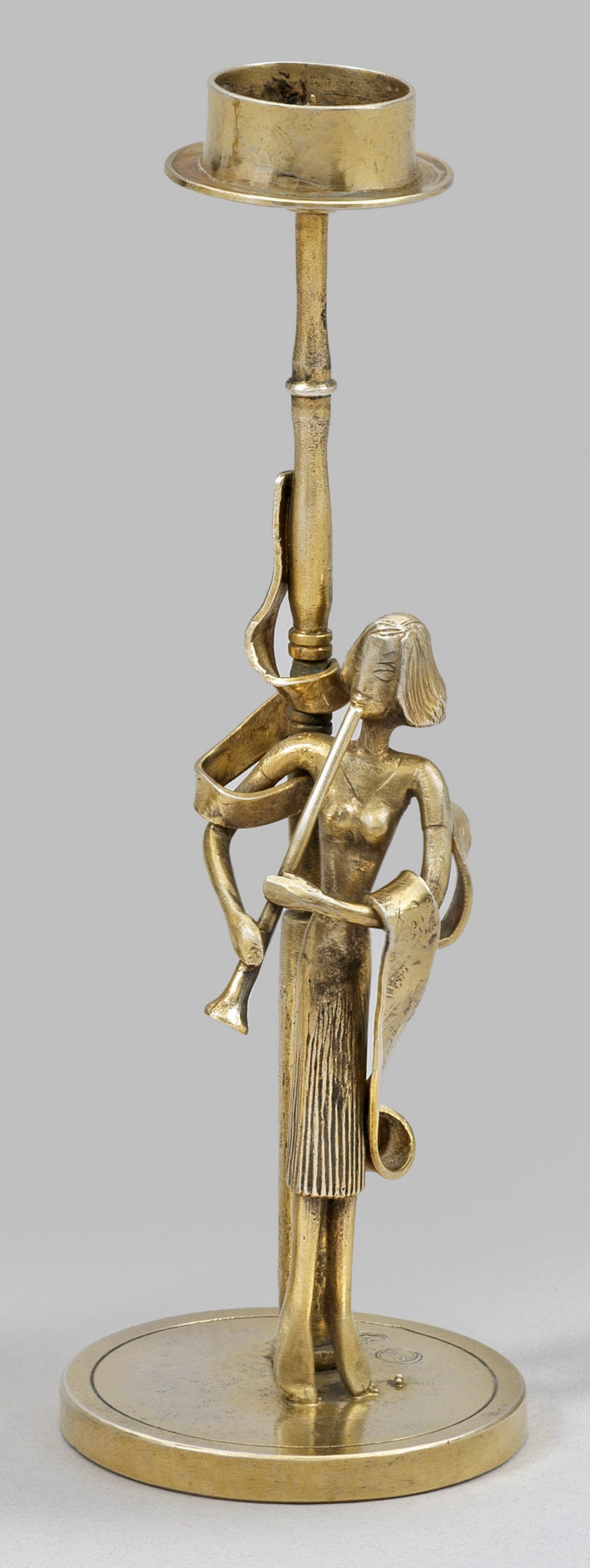 Silber, voll vergoldet. Über runder Plinthe mittig aufsteigender, gering balustrierter und mehrfach gegliederter Schaft, bekrönt von zylindrischer Tülle über ausgestelltem Rand. Vor dem Schaft die abstrakt skulpturale und feingliedrige Darstellung einer Musizierenden mit Oboe. Um die Schulter und den Schaft ein stolaähnlich geschwungenes, zartes Band. Auf der Bodenunterseite bez. "Zeitner Lüneburg". Gest. 830, Meisterzeichen "HZ". Gew. ca. 170 g. H. 15,7 cm.