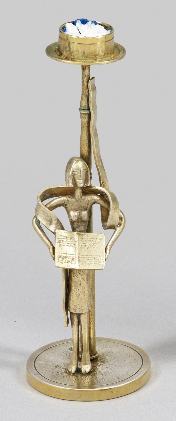 Silber, voll vergoldet. Über runder Plinthe mittig aufsteigender, gering balustrierter und mehrfach gegliederter Schaft, bekrönt von zylindrischer Tülle über ausgestelltem Rand. Vor dem Schaft die abstrakt skulpturale und feingliedrige Darstellung einer Sängerin mit Notenblatt. Um die Schulter und den Schaft ein stolaähnlich geschwungenes, zartes Band. Auf der Bodenunterseite bez. "Zeitner Lüneburg". Gest. 830, Meisterzeichen "ZN". Gew. ca. 175 g. H. 15,7 cm.