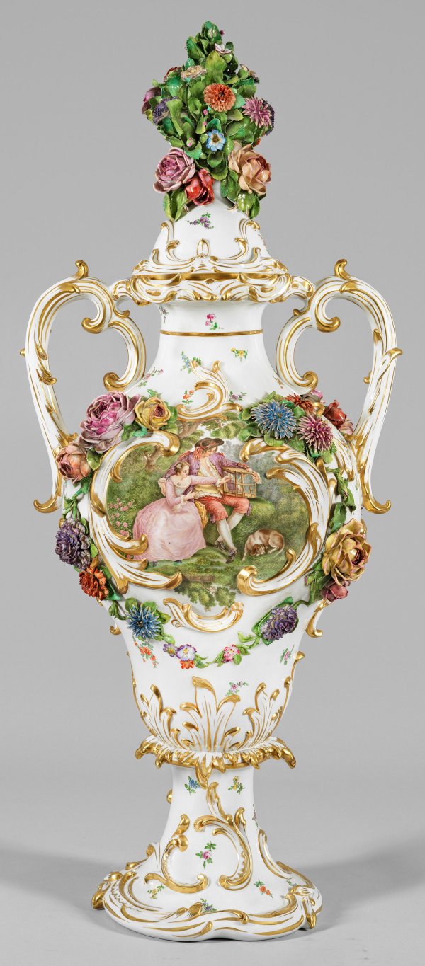 Über stark geschweiftem, eingezogenem Fuß mittig sich balusterförmig aufwölbender Korpus mit eingezogener Schulter, seitlichen Volutenhenkeln und passig geschweiftem Rand. Glockenförmiger Deckel mit reichem Bukett aus plastischen Blüten. Fuß und Korpus umzogen von reliefierten Blüten-Rocaillen. Schauseitig der Wandung reliefierte Rocaillereserve mit plastischem Feston aus Blüten. Darin galantes Paar in blühender Parklandschaft nach Watteau bzw. rücks. Blumenbukett. Allseits Streublümchen. Feine polychrome Malerei mit reicher Goldstaffage. Minim. best./rest.; Manufakturmarke. Ges.-H. 125 cm.