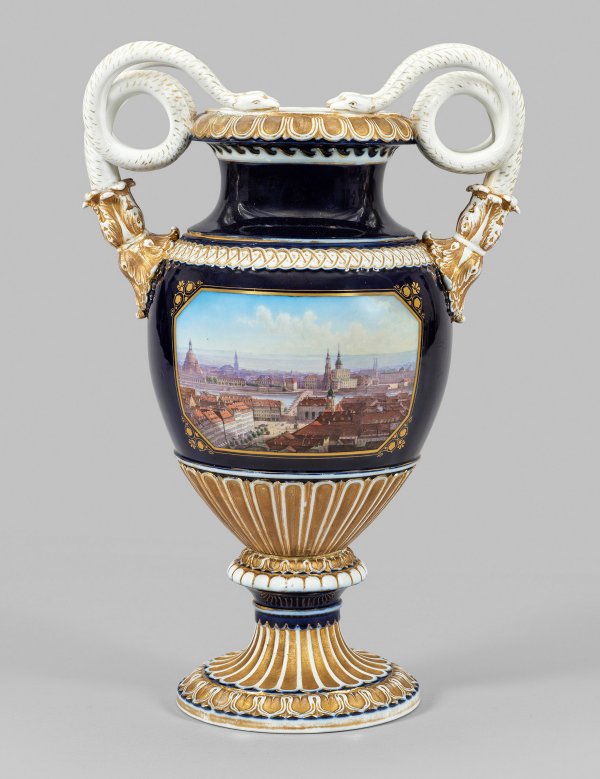 Amphorenförmiger Korpus, umzogen von reliefierten Ornamentbordüren. Seitliche, aus plastischem Akanthusblattansatz aufsteigende Henkel in Gestalt von spiralförmig eingerollten Schlangenpaaren. Schauseitig in kobaltblauem Fond ausgesparte, achtkantige, teilw. goldornamentierte Reserve. Darin die minutiös dargestellte Ansicht von Dresden mit Blick von der heutigen Neustadt mit Häuserzeilen über die Augustusbrücke auf die Altstadt, darunter die Frauenkirche, die Hofkirche und der Hausmannsturm mit Residenzschloss. Die rückseitige Reserve mit Blumenbukett. Äußerst feine polychrome Malerei mit Goldstaffage. Form-Entw. Ernst August Leuteritz. Modell-Nr. A 148. Unw. rest.; Minim. ber.; Schwertermarke. H. 48 cm.