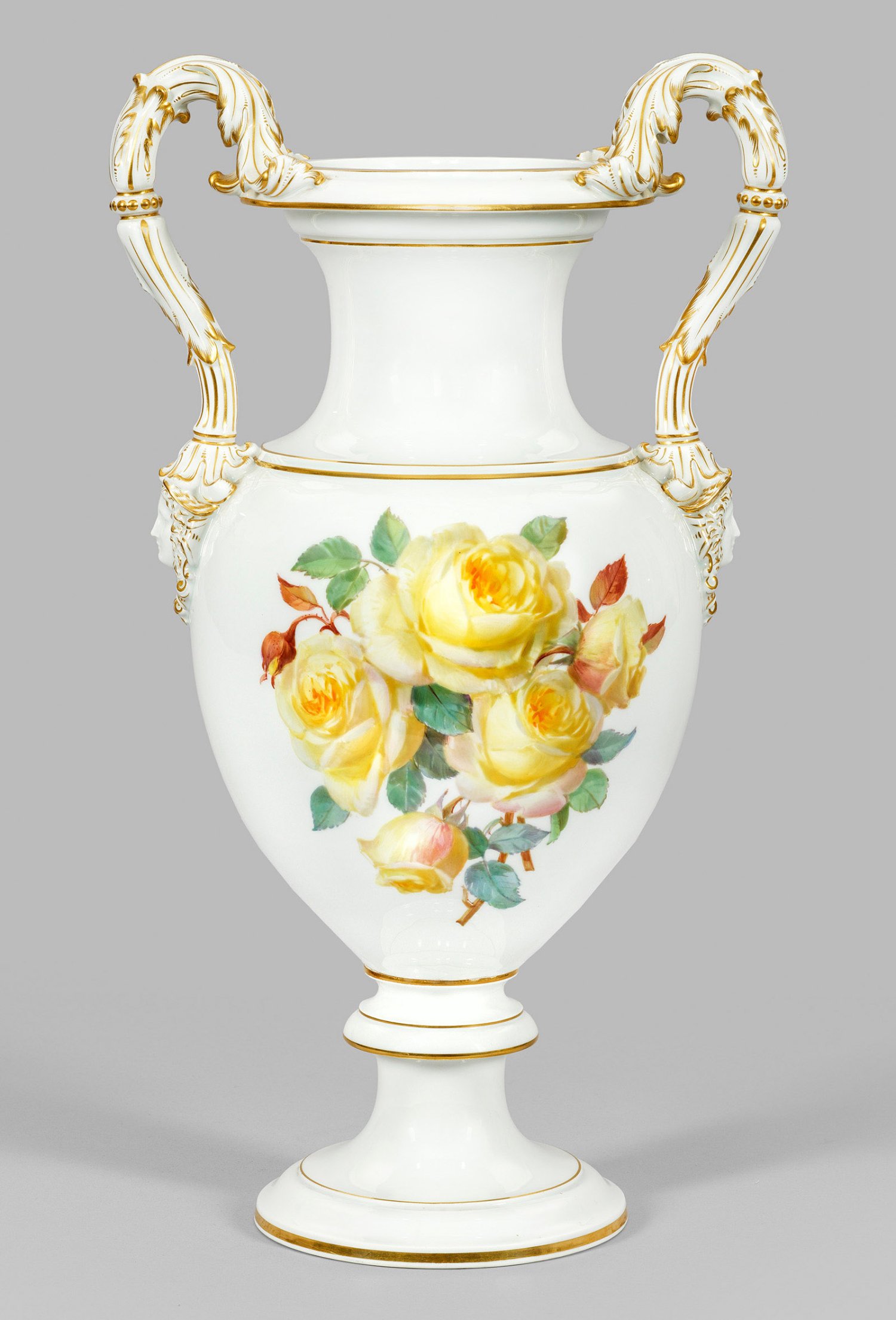 Über profiliertem, sich verjüngendem Rundfuß ovoider Korpus mit gerundeter Schulter, in eingezogenen Hals und weit ausschwingenden Rand übergehend. An der Schulter ansetzende, blattförmig geschwungene Henkel mit weiblichen Maskarons. Beidseitig der Wandung großflächiges Arrangement aus blühenden sowie knospenden gelben bzw. roten Rosen in weicher, impressionistisch anmutender Malerei. Goldstaffage. Modell-Nr. G 125. Form-Entw. Ernst August Leuteritz, um 1863 - 1866. Schwertermarke. H. 52,5 cm.
