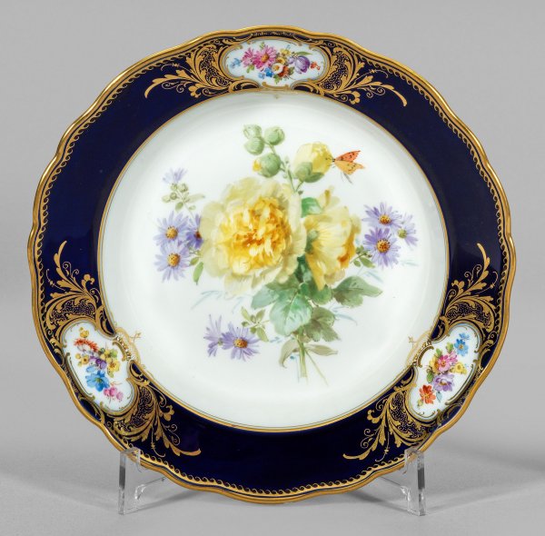 Runde, gemuldete Form "Neuer Ausschnitt". Im Spiegel farbenprächtig, impressionistisch anmutendes Arrangement wilder Rosen und Astern mit Schmetterlingen in lasierender, weichtoniger Malerei. In den Rocaillekartuschen der Fahne verschiedene Blumengebinde auf kobaltblauem Grund. Goldstaffage. Schwertermarke. D. 23,5 cm.