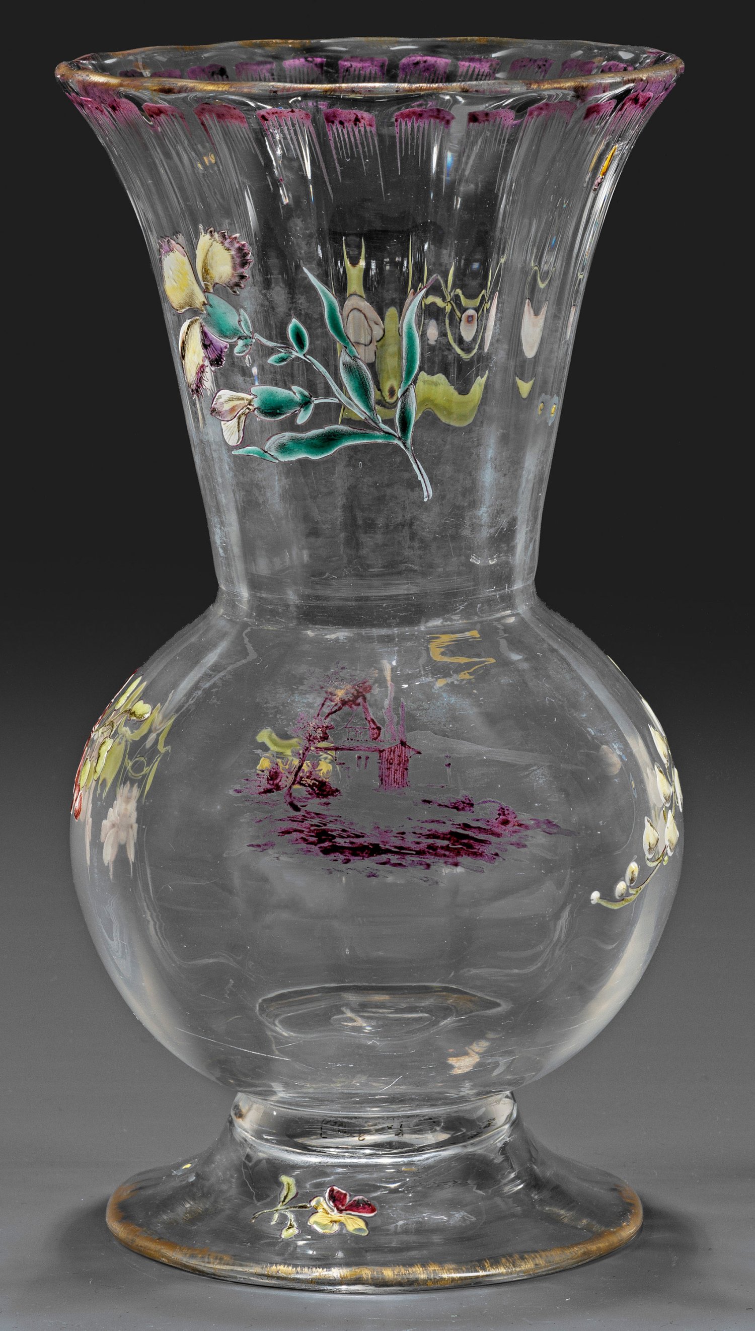 Gefußte Baluster mit Glockenfuß, kugeligem Korpus und abgesetztem, glockenförmig ausschwingendem, hohem Hals. Farbloses Glas, längsoptisch geblasen. Als Dekor eine kleine Landschaft in Pupurcamaieu sowie gestreute Blumen und Insekten in polychromer Emailmalerei, der Rand in Gold und Purpur akzentuiert. Sign. "Cristallerie d'Emile Gallé Nancy"(/) "Modèle et décor déposé" (in schwarzer Schrift). H. 20,2 cm.