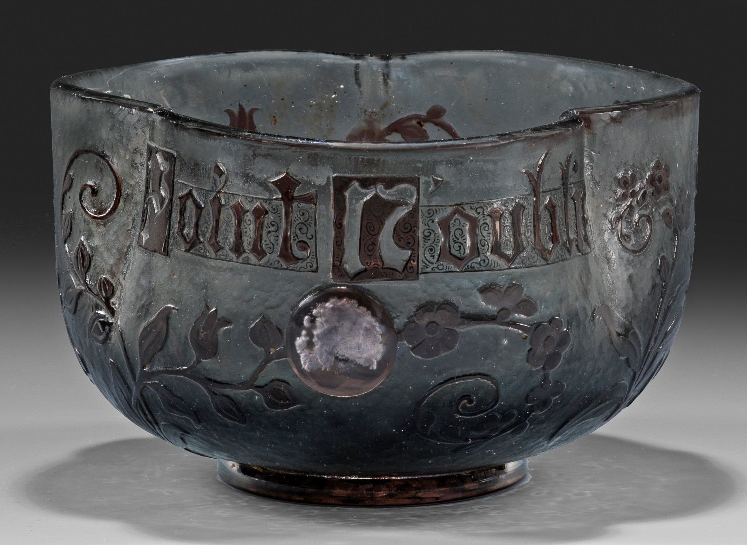 Tief gemuldete Form mit dreipassig gekniffenem Rand. Rauchfarbenes, graues, transparentes Glas. Geätzter Dekor mit blühenden Vergissmeinnicht-Stängeln, schauseitiger Spruch "point n'oublie" in gotischer Schrift; drei runde Cabochon-Applikationen auf Platinfolie, dekoriert mit geschnittenen Vergissmeinnicht-Blüten. Teilw. martellierter Grund. Am Boden Ätz-Sign. "Emile Gallé f(eci)t" mit Vergissmeinnicht-Blüte. H. 10,3 cm; D. 17 cm.