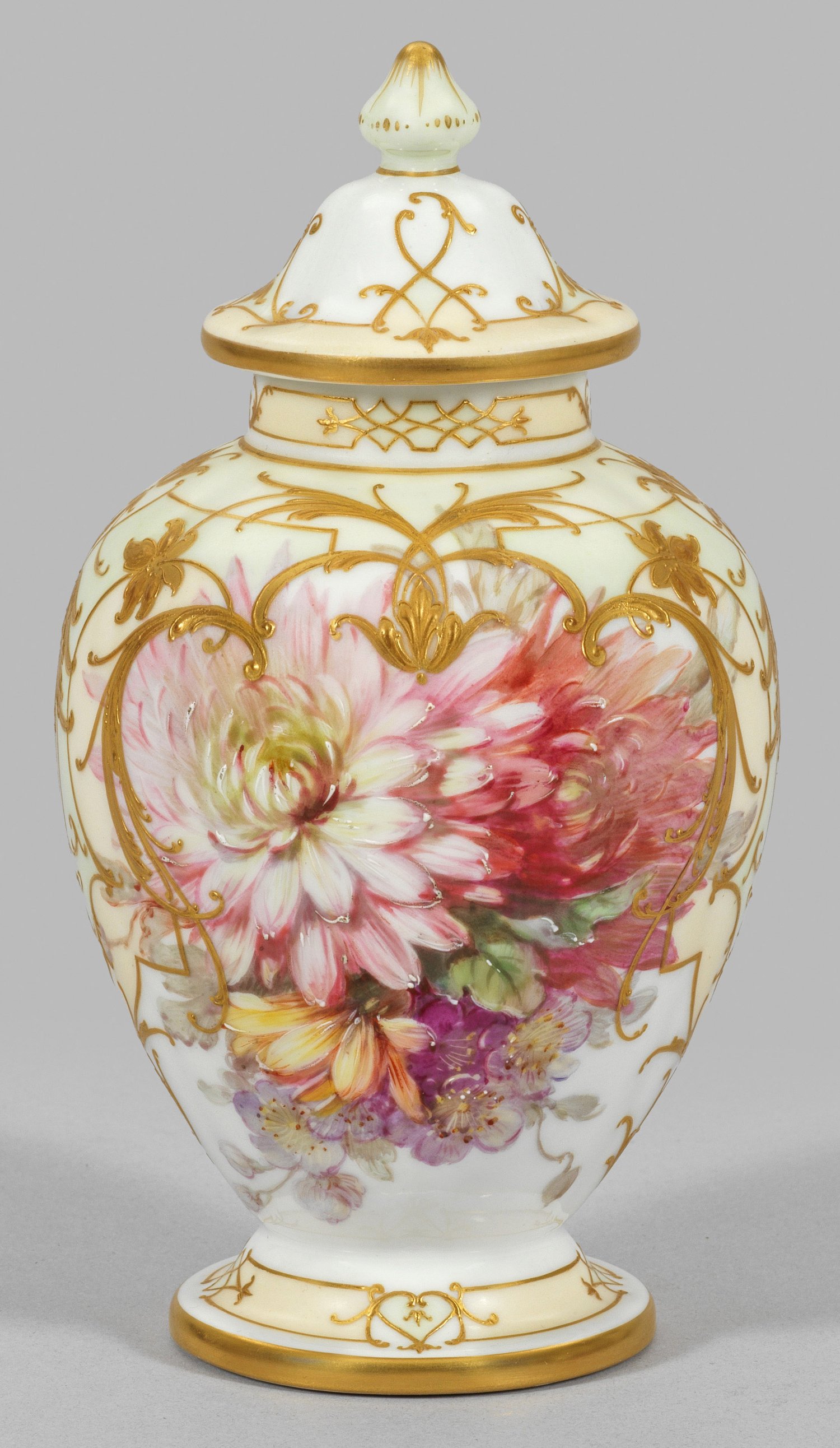 Sog. "Potpourri chinesischer Form". Über dem Rundstand eiförmig sich erweiternder Korpus mit stark eingezogener Schulter und kurzem zylindrischen Hals. Passig aufgewölbter pagodenförmiger Deckel mit Balusterknauf. Beidseitig der Wandung Blütenarrangements aus Astern und Narzissen in feiner teilw. weißgehöhter Weichmalerei von Max Liebenau, umzogen von dichten floralen- und ornamentalen Reliefgoldbordüren mit verschiedenen pastelltonigen Farbfonds. Dekormalerzeichen für Willi Schäfer. Minim. rest.; Zepter- und Malereimarke. H. 17,5 cm.