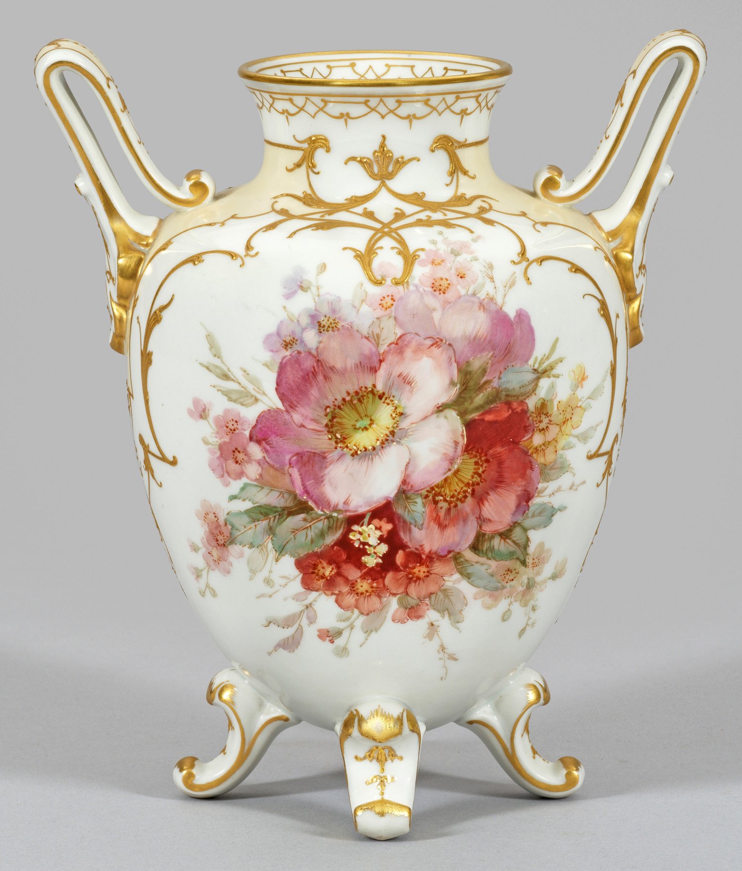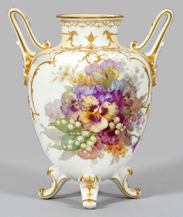 Von vier Blattvolutenfüßen getragener, ovoider Korpus mit eingezogenem Hals und ausschwingendem Rand. Seitlich hochgezogene, stilisierte Blatthenkel. Beidseitig der Wandung spiegelfüllendes, dichtes und diffus verlaufendes Blumenarrangement aus Stiefmütterchen und Maiglöckchen bzw. Apfelblüten in zarttoniger, teilw. weißgehöhter Weichmalerei. Umlaufender Reliefgolddekor aus feinliniger Ranken- und stilisierter Blütenornamentik als Rahmung der zartgelben Fondflächen. Form-Entw. Julius Wilhelm Mantel. Dekormalerzeichen für Frank Letzner. Zepter- und Malereimarke. H. 20,5 cm.