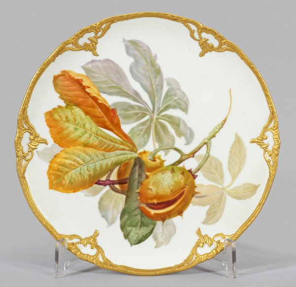 Runde, leicht vertiefte Form mit passig geschweiftem, reliefiertem Rocaillerand aus Biskuitporzellan. Spiegelfüllende Darstellung eines Kastanienzweiges mit der geöffneten Nussfrucht in polychromer, weichtoniger Malerei. Malerzeichen. Minim. rest.; Zepter- und Malereimarke. D. 22 cm.