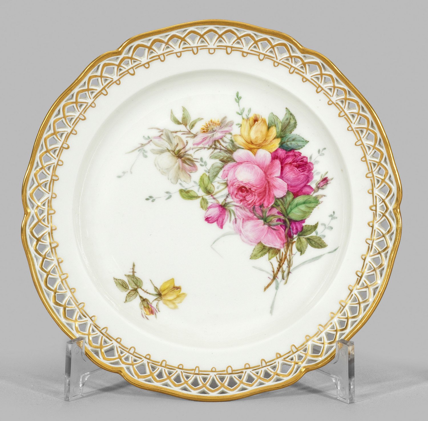 Runde Form mit durchbrochen gearbeiteter Fahne, sog. "Englischglatt". Im leicht vertieften Spiegel ein Arrangement aus Rosen in weichtoniger Malerei. Goldstaffage. Zeptermarke. D. 19,5 cm.