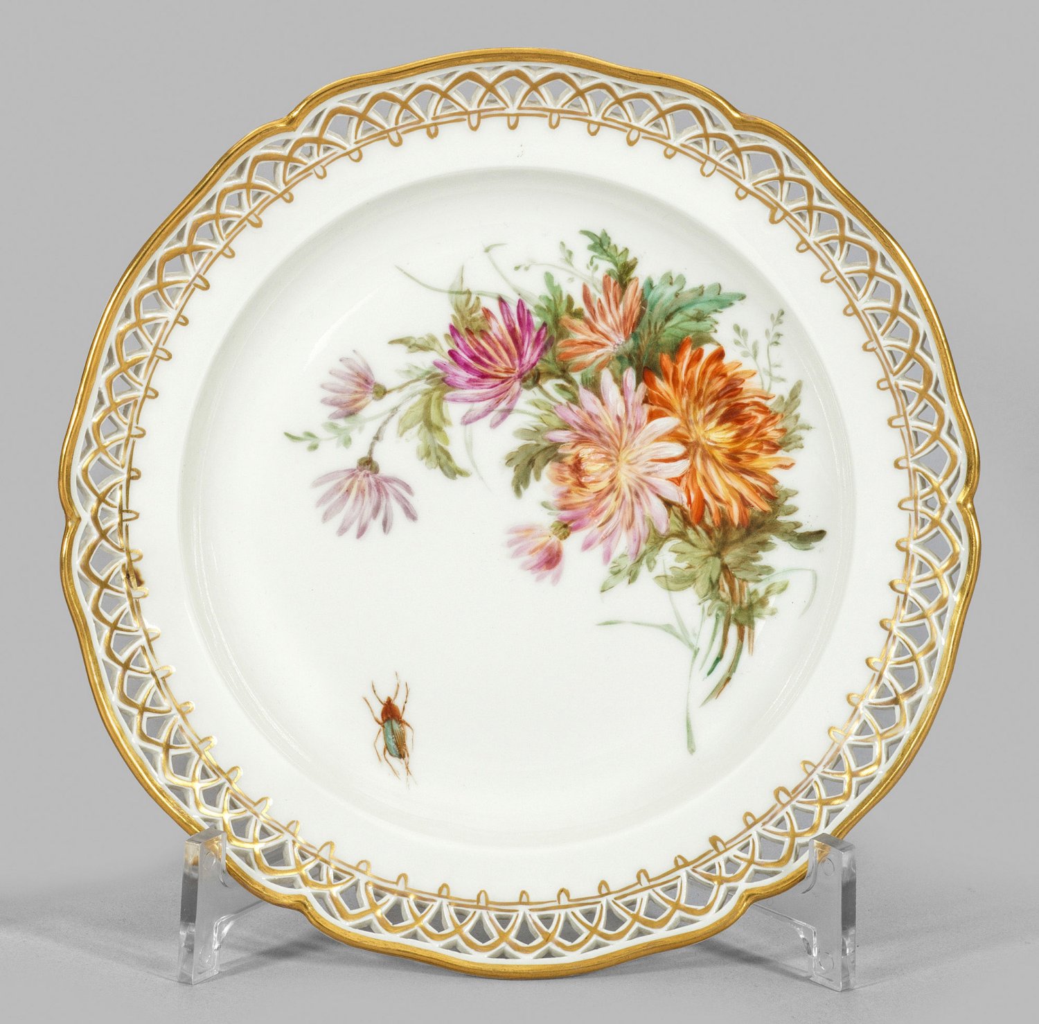 Runde Form mit durchbrochen gearbeiteter Fahne, sog. "Englischglatt". Im leicht vertieften Spiegel ein Asternbukett und ein Käfer in polychromer, weichtoniger Malerei. Goldstaffage. Zeptermarke. D. 19,5 cm.